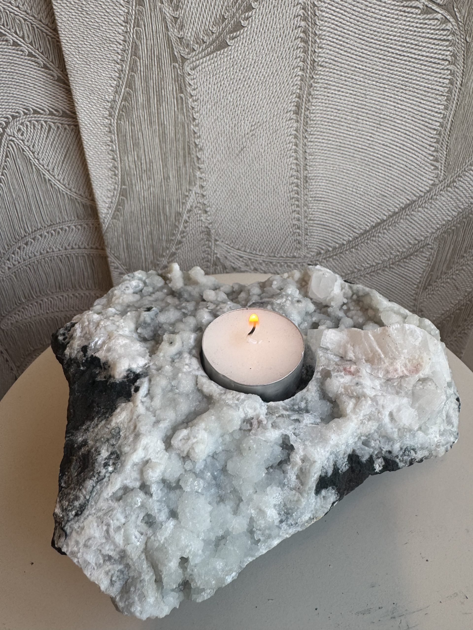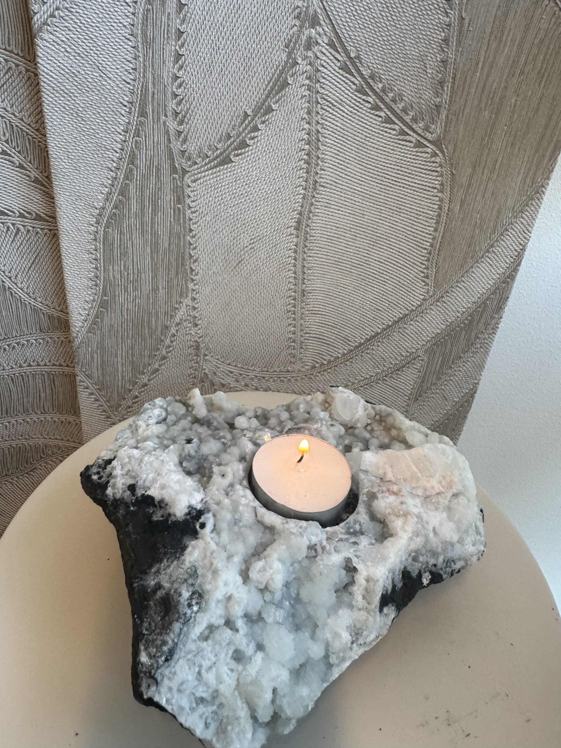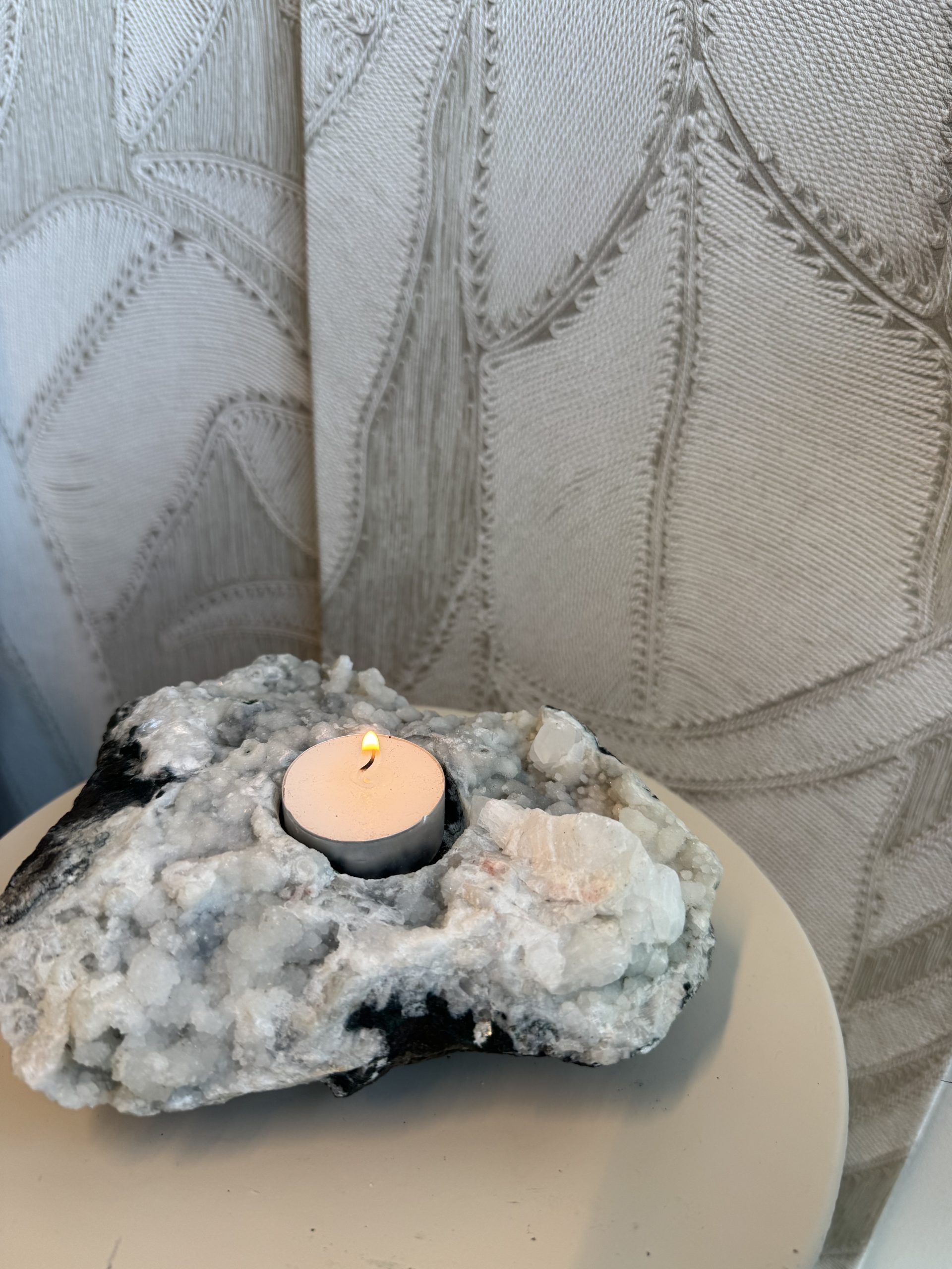Deze theelichthouder van calciet met kwarts straalt warmte en rust uit.