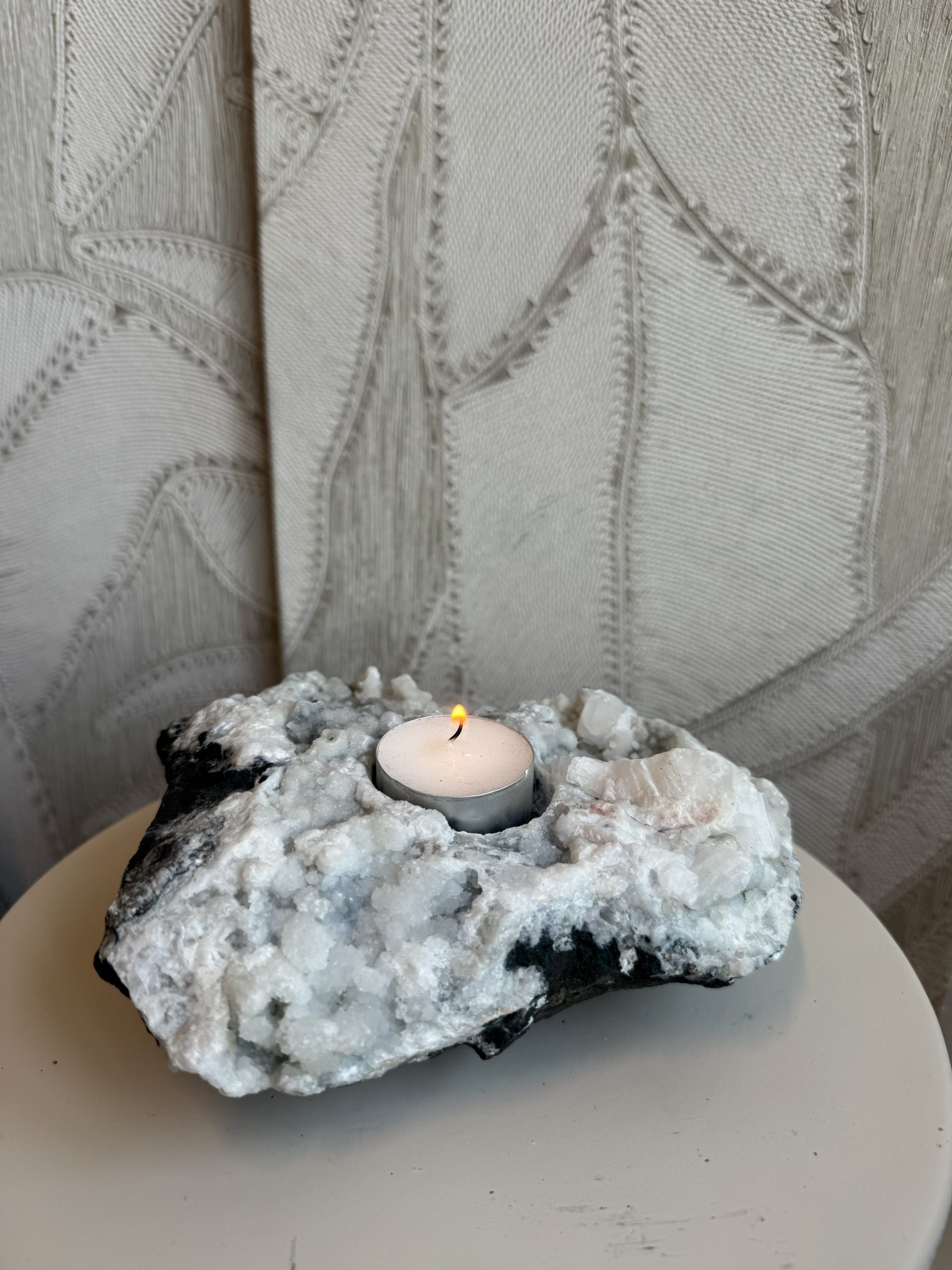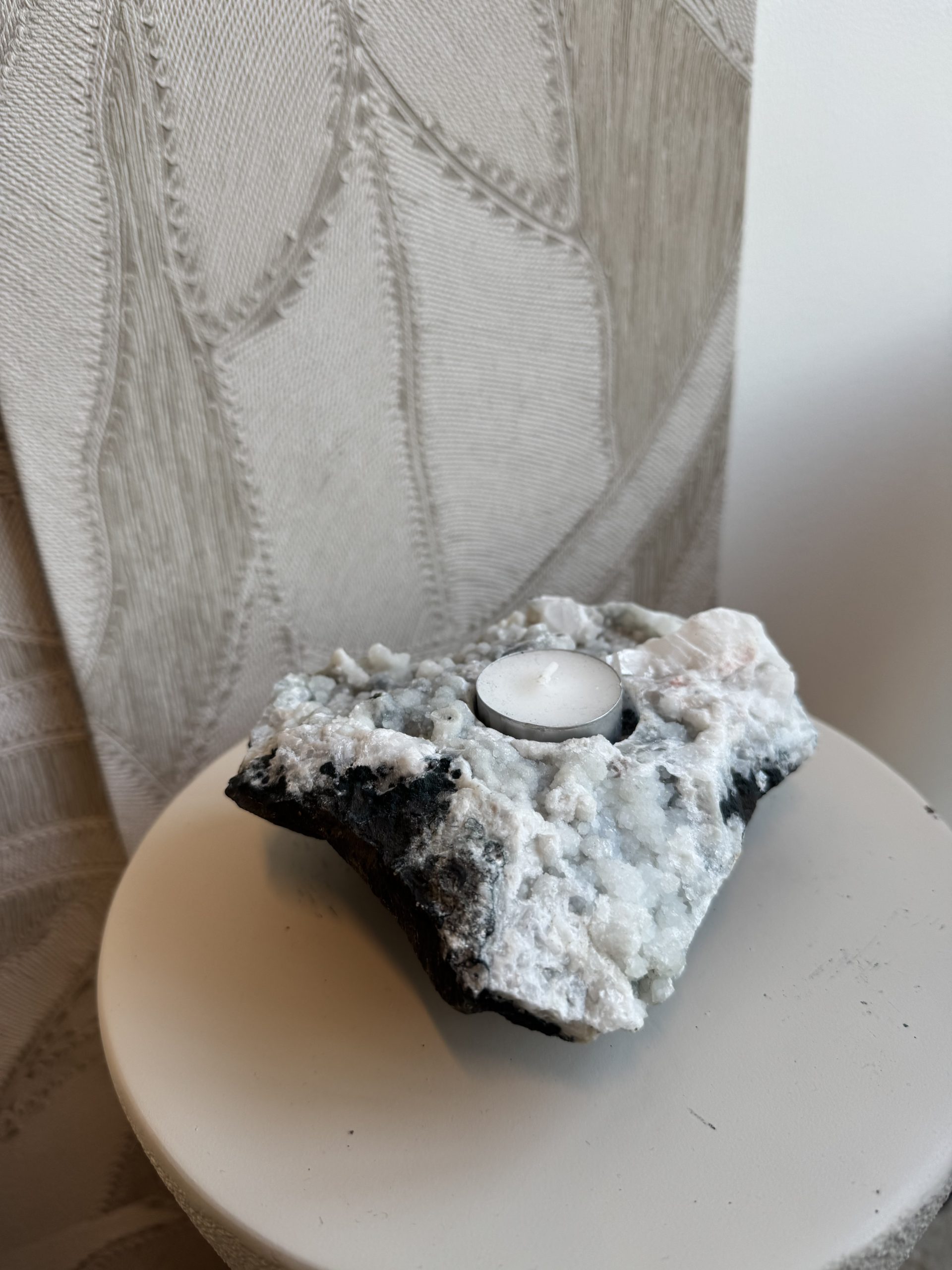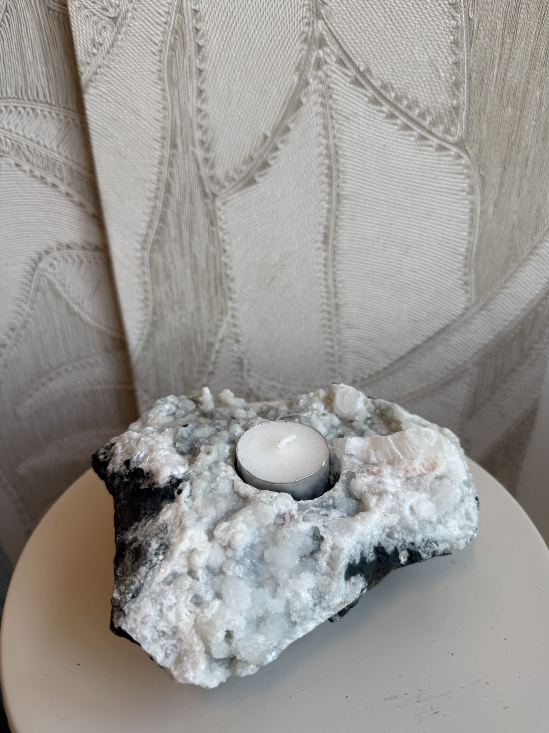 Deze theelichthouder van calciet met kwarts straalt warmte en rust uit.
