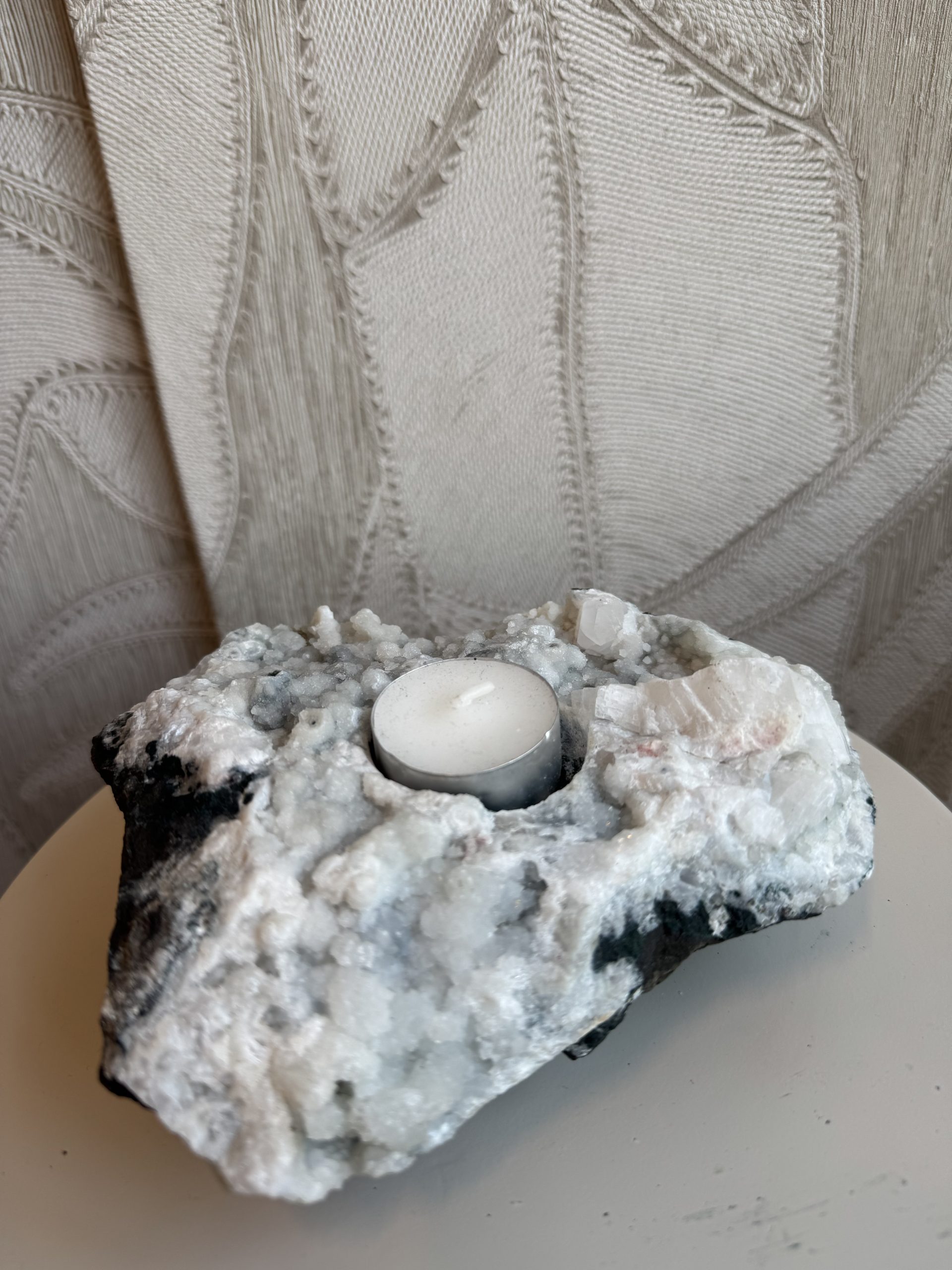 De zachte, natuurlijke tinten van calciet worden prachtig aangevuld door de sprankelende kristallen van kwarts, die het kaarslicht op een sfeervolle manier weerkaatsen. Elk stuk is uniek door de natuurlijke vormen en structuren van de steen. Perfect als decoratief accent in huis, voor een moment van ontspanning of om een serene sfeer te creëren.