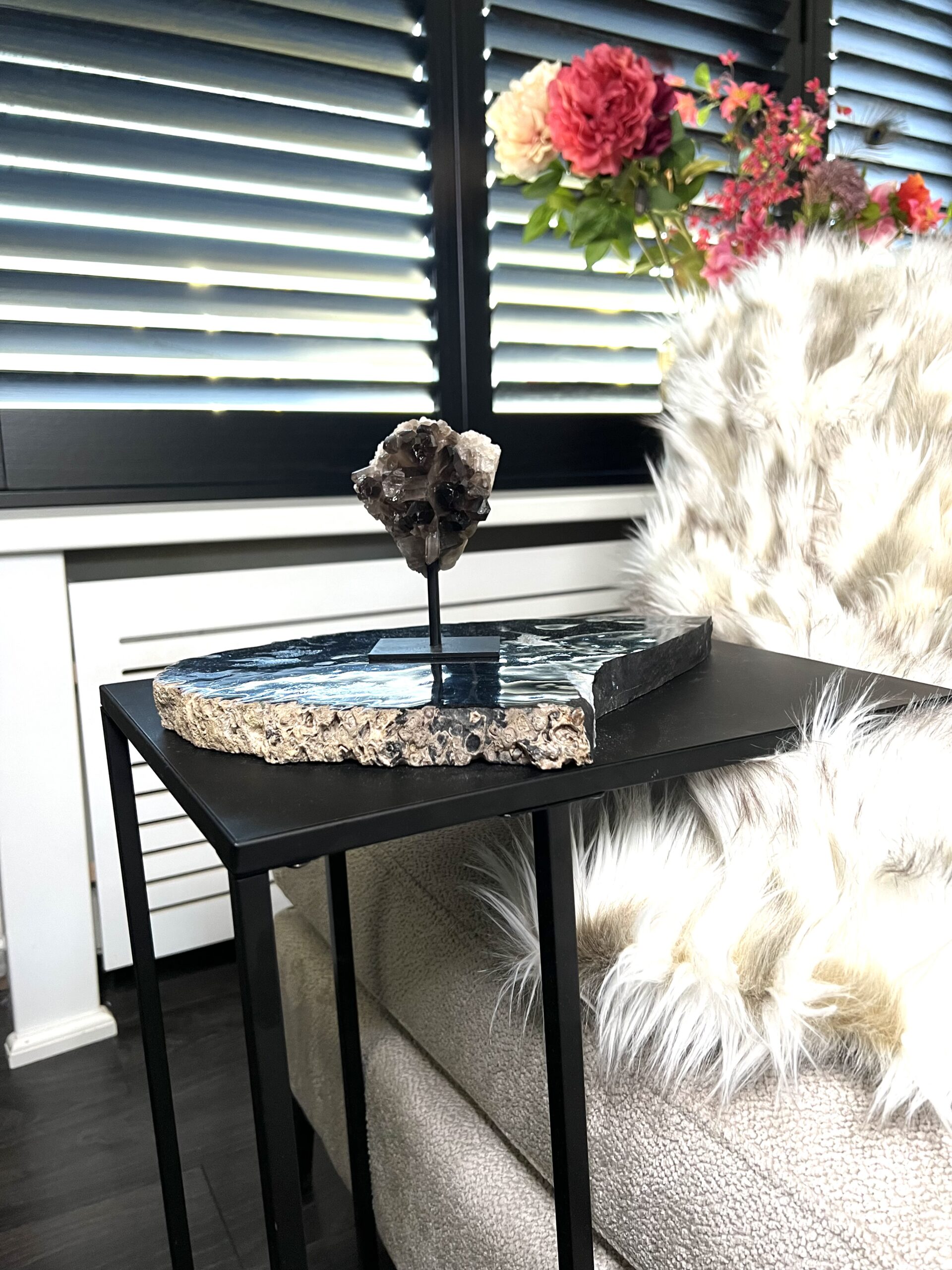 Wat een prachtig stuk rookkwarts op standaard! De donkere kristalpunten doet ons hartje sneller kloppen. De variatie in textuur zorgt voor zowel een magische look en tegelijkertijd heeft het een zeer krachtige uitstraling.