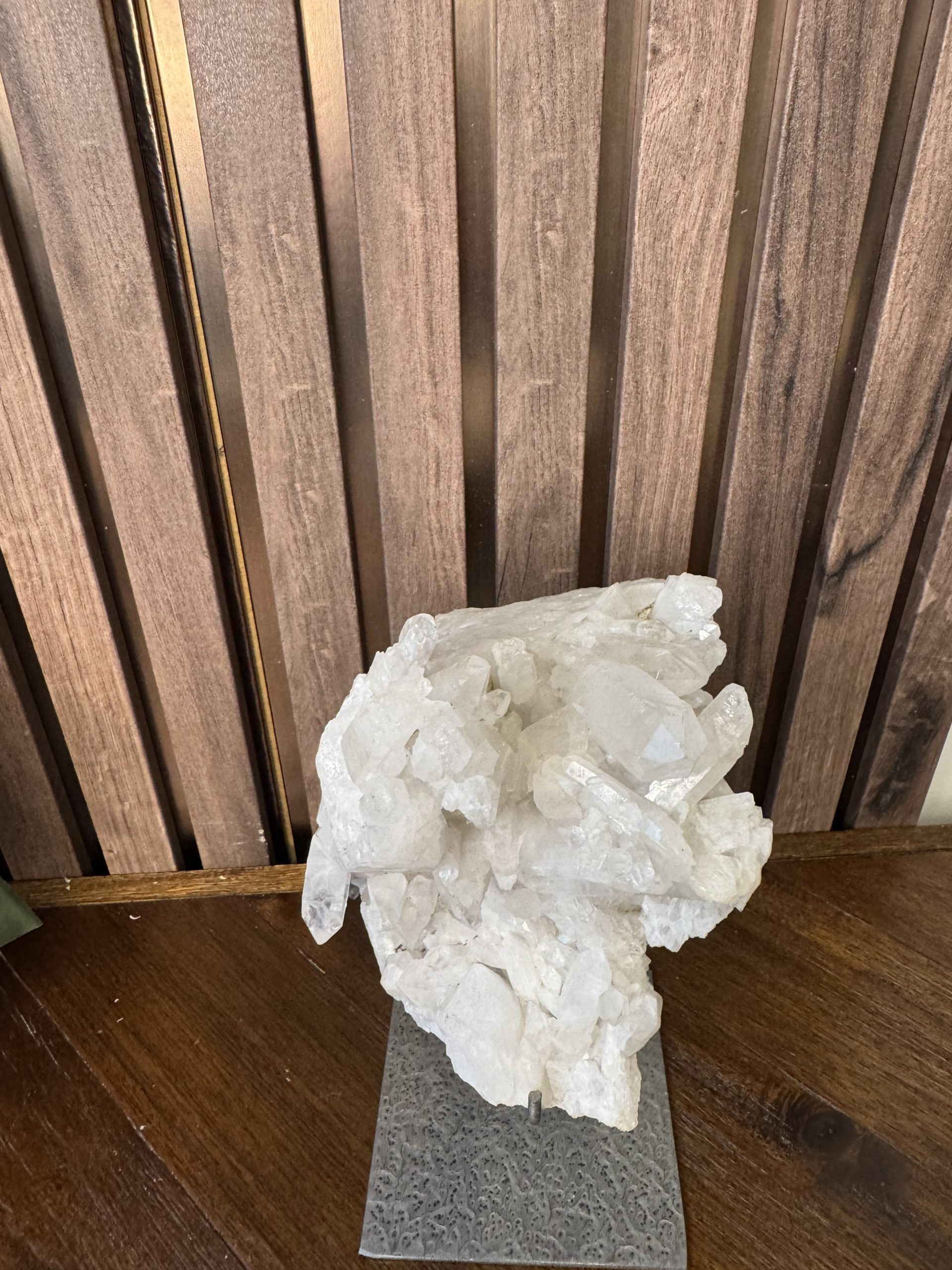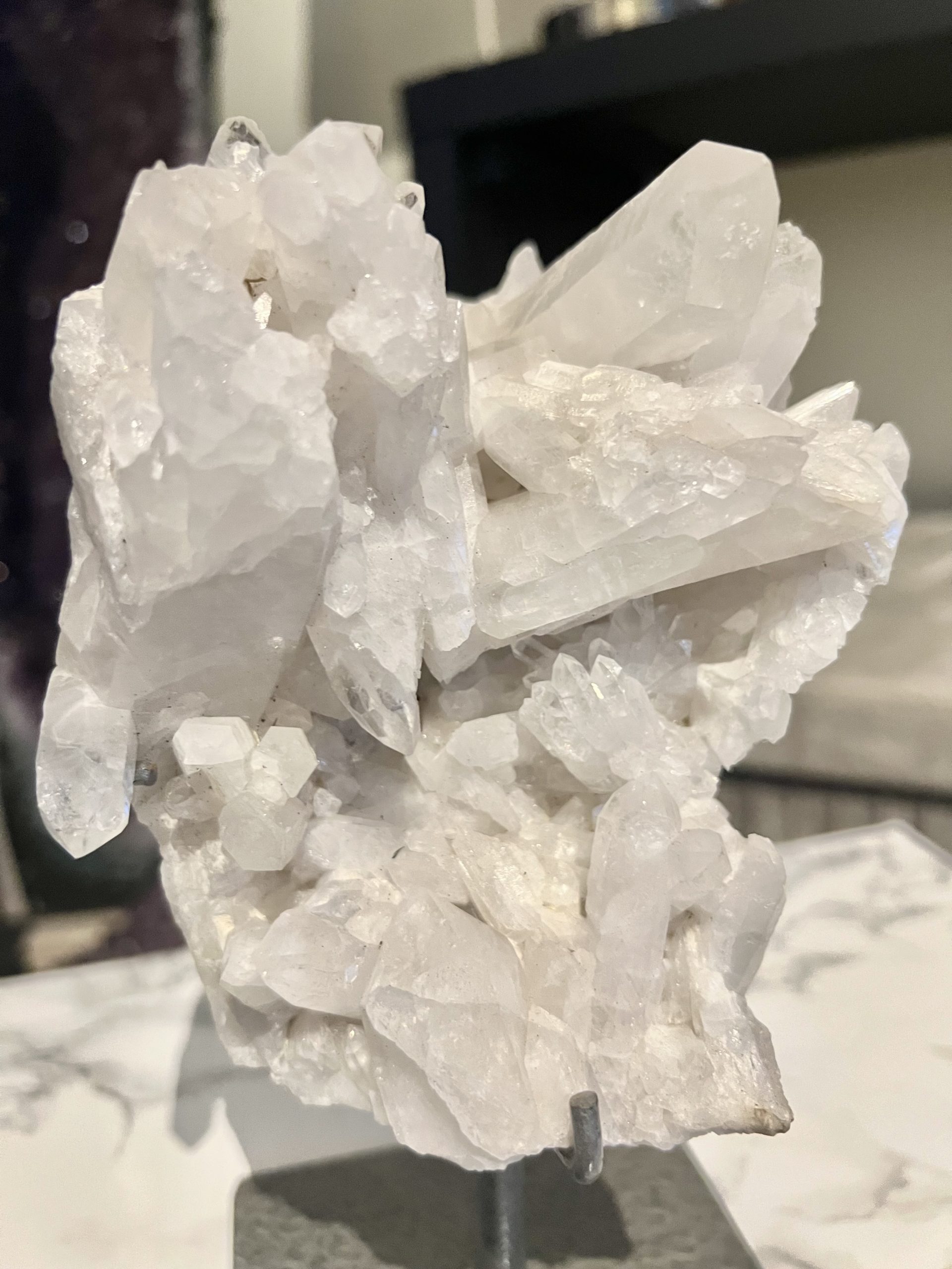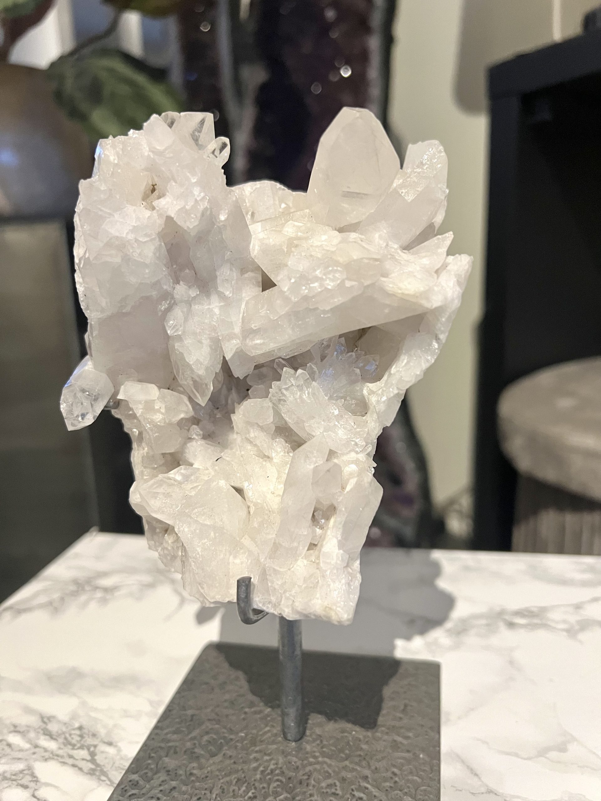Een kristalcluster op een prominente plek kan dienen als een anker of focuspunt voor persoonlijke intenties of doelen.