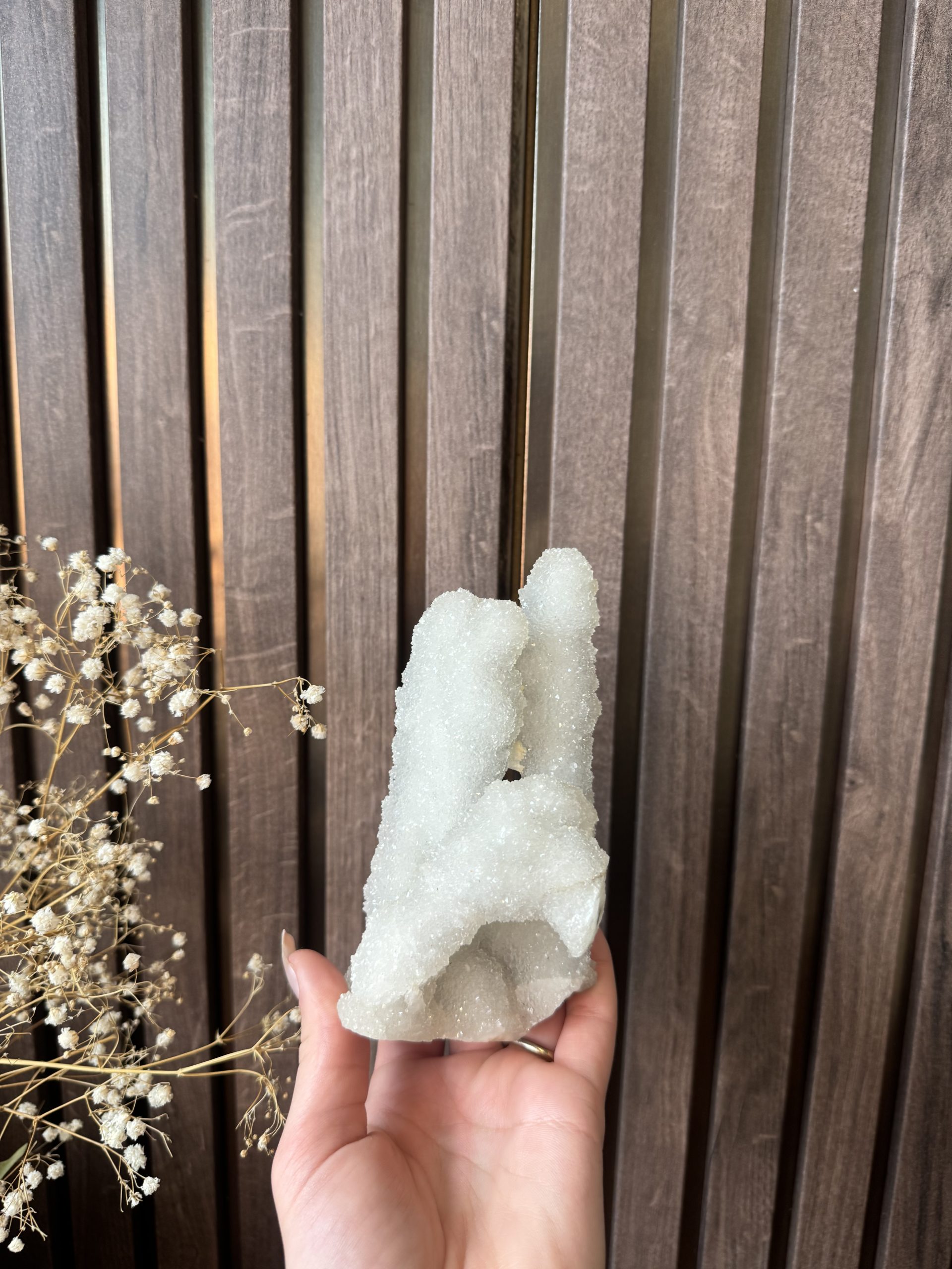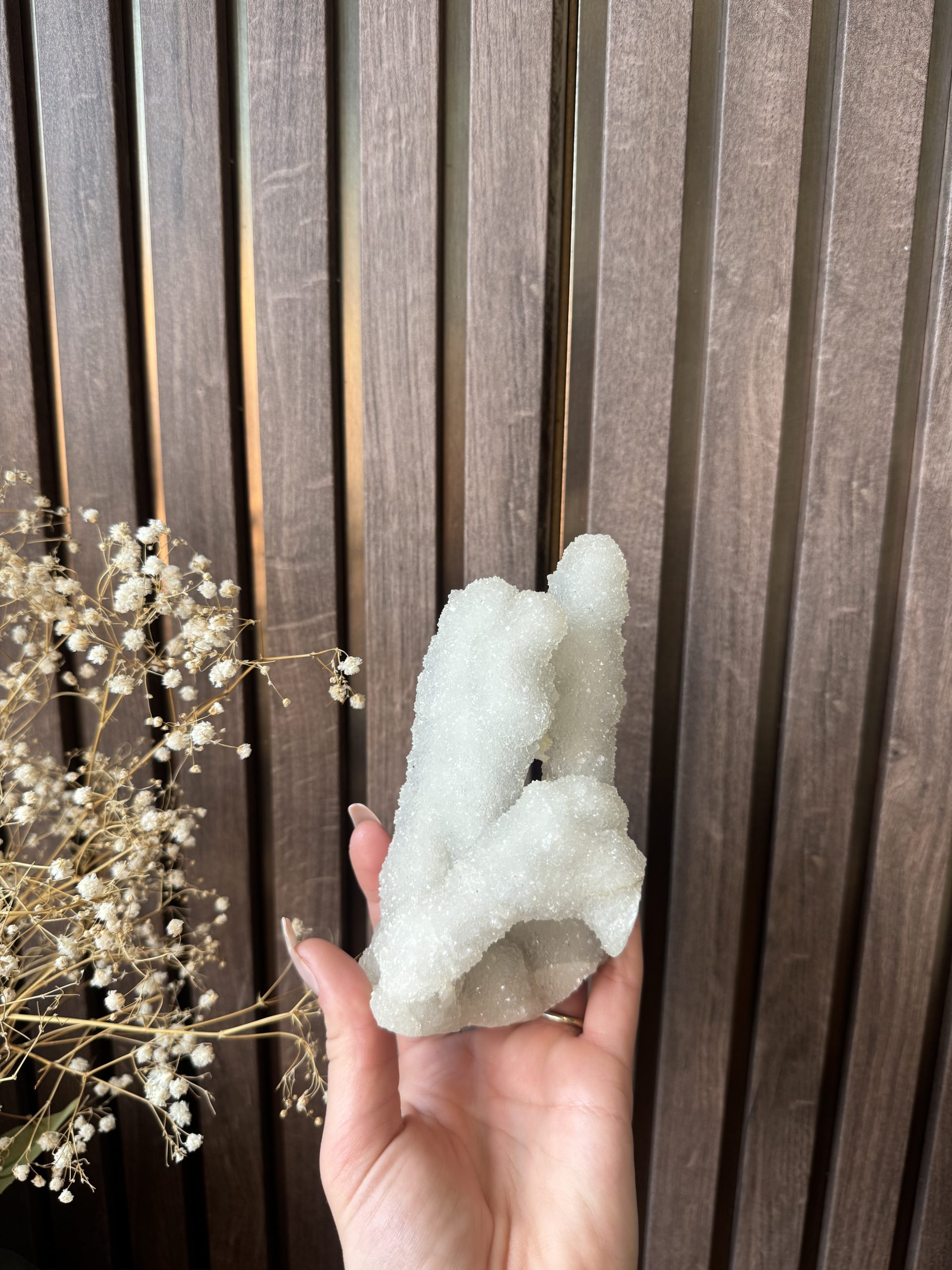 Hoewel de steen wit oogt, speelt hij prachtig met het daglicht, waardoor er diepte en een lichte parelmoerglans ontstaat. De witte variant wordt vaak geassocieerd met vrede, focus en het filteren van negatieve prikkels.