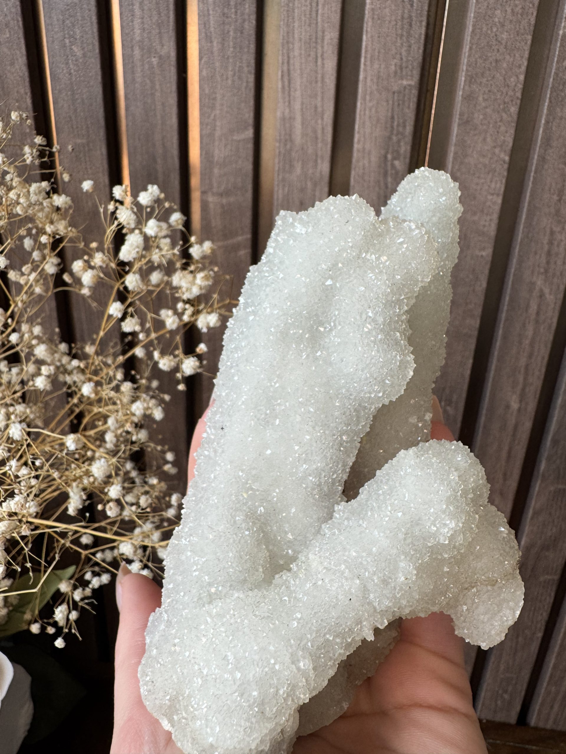 Deze witachtige Andaliet is een zeldzame vondst voor wie houdt van subtiele luxe. Met zijn zachte, melkachtige glans en kristalachtige structuur brengt dit object een rustige, bijna ijzige elegantie in elk interieur.