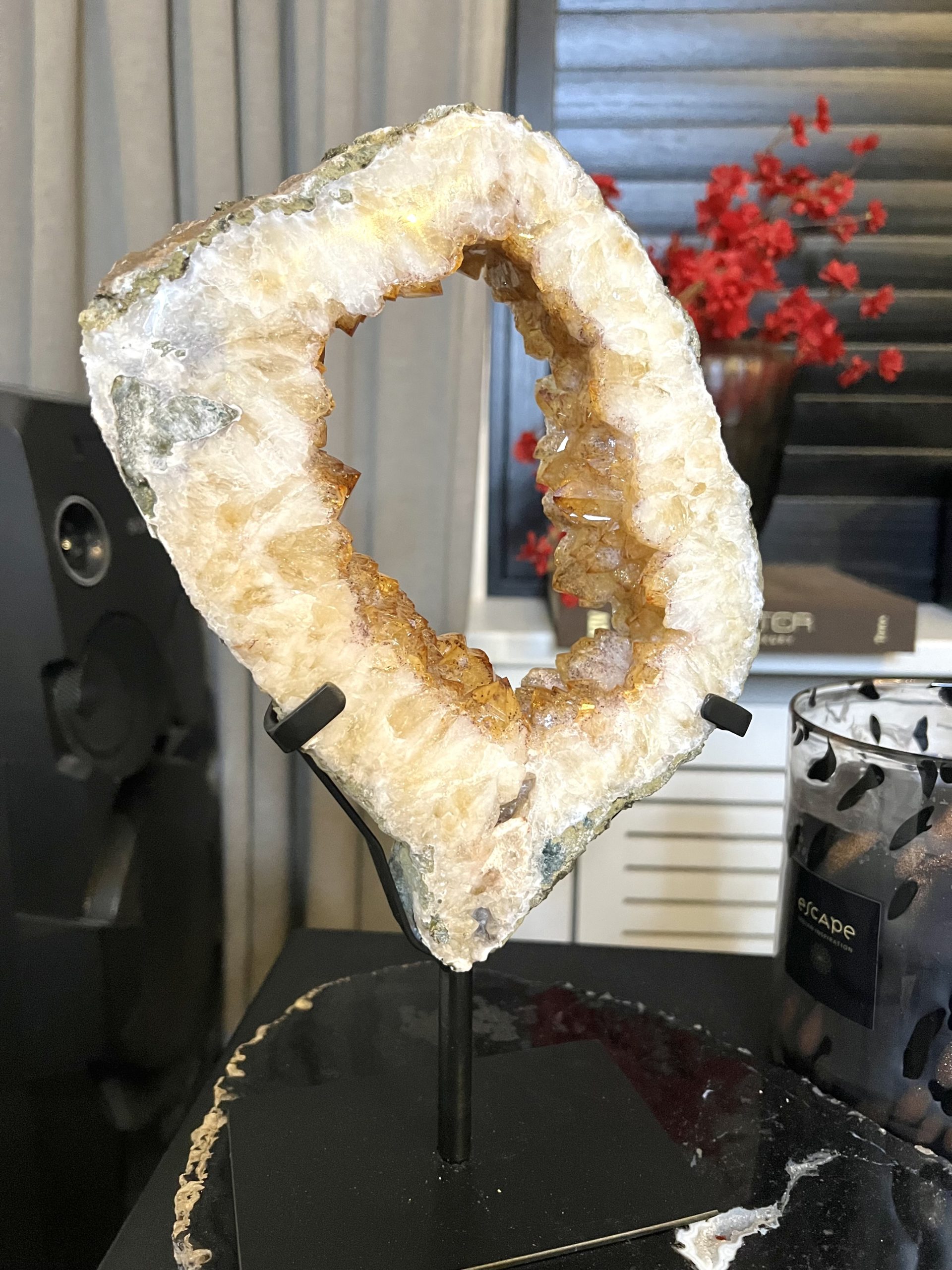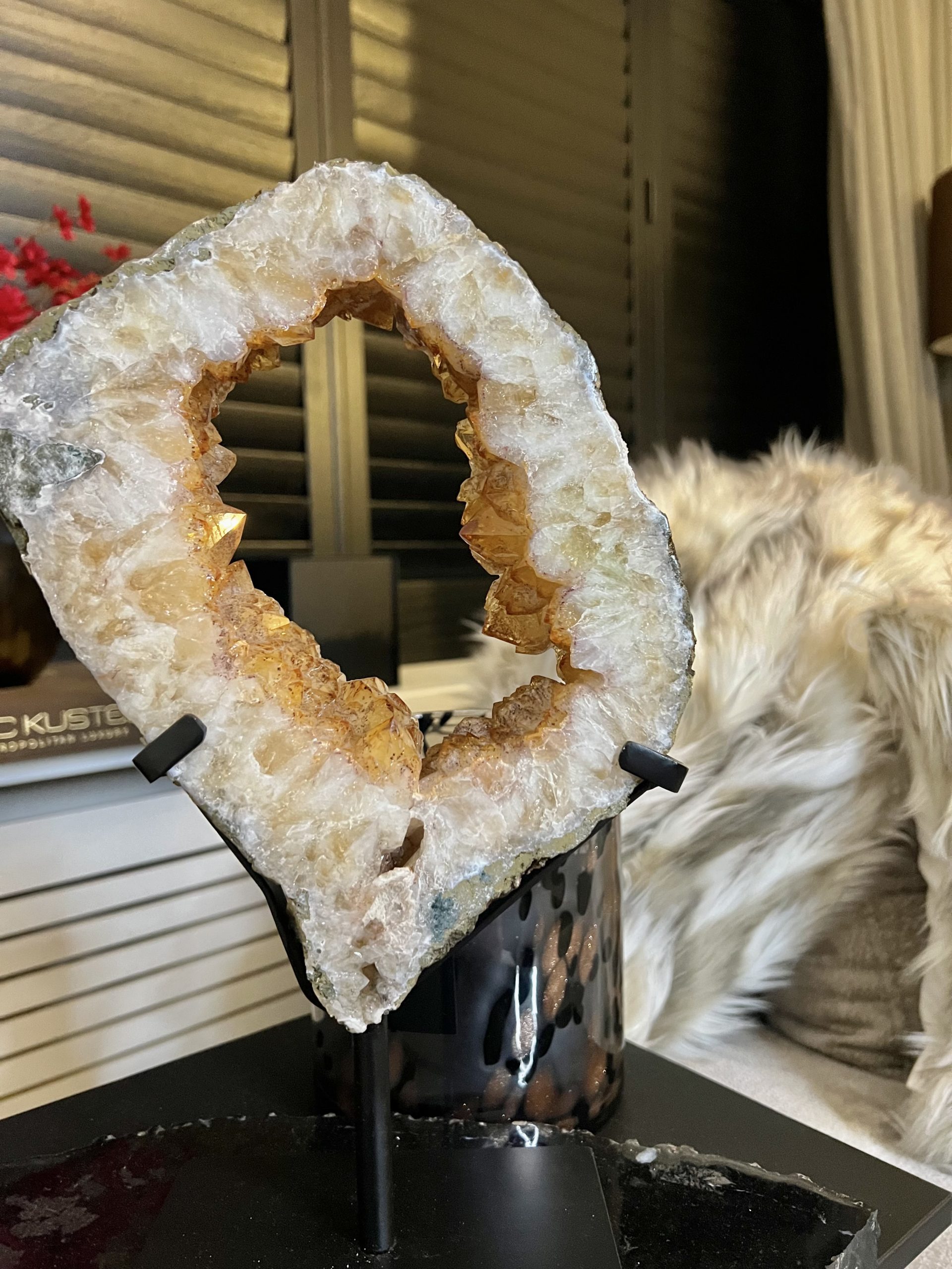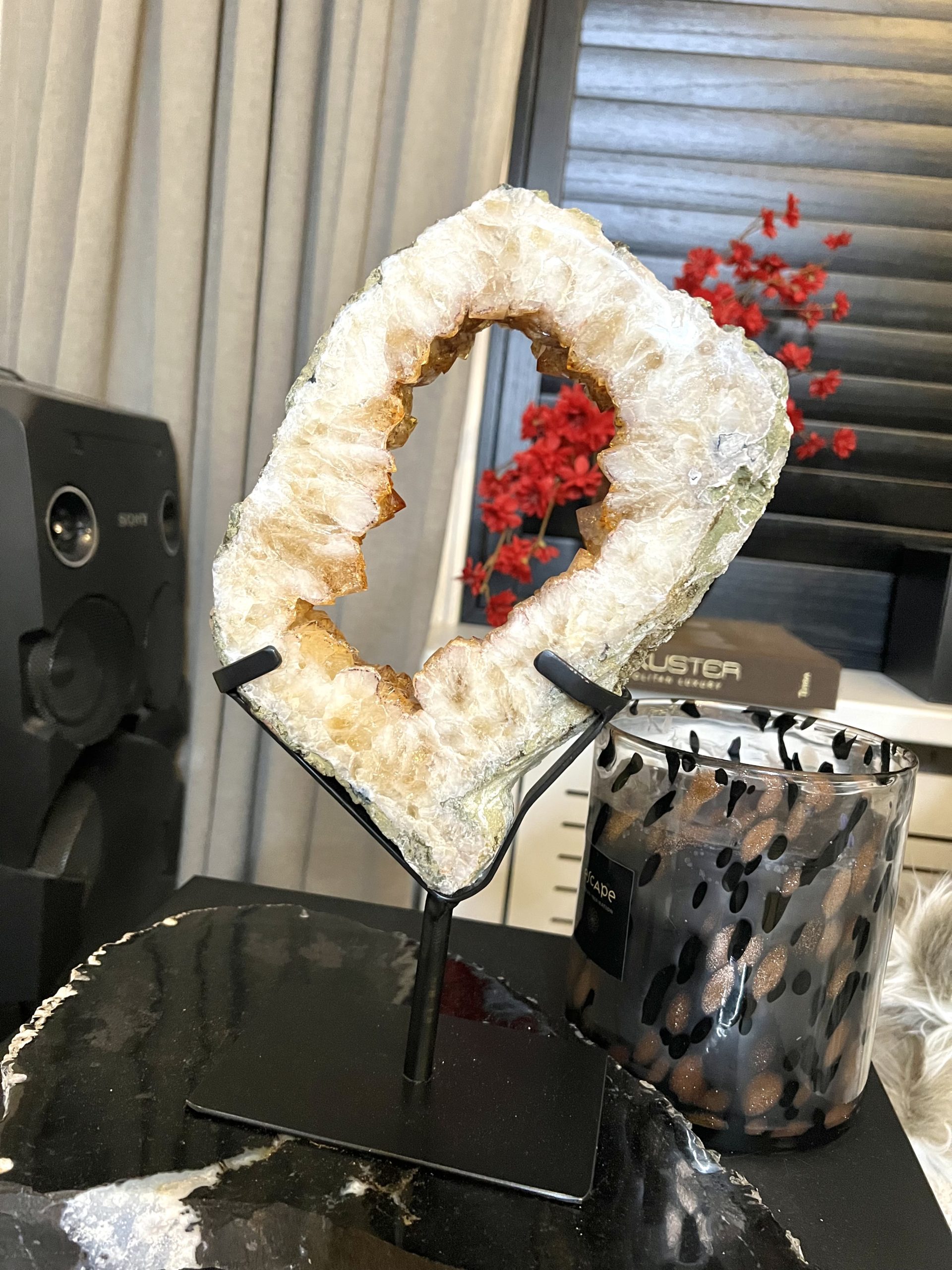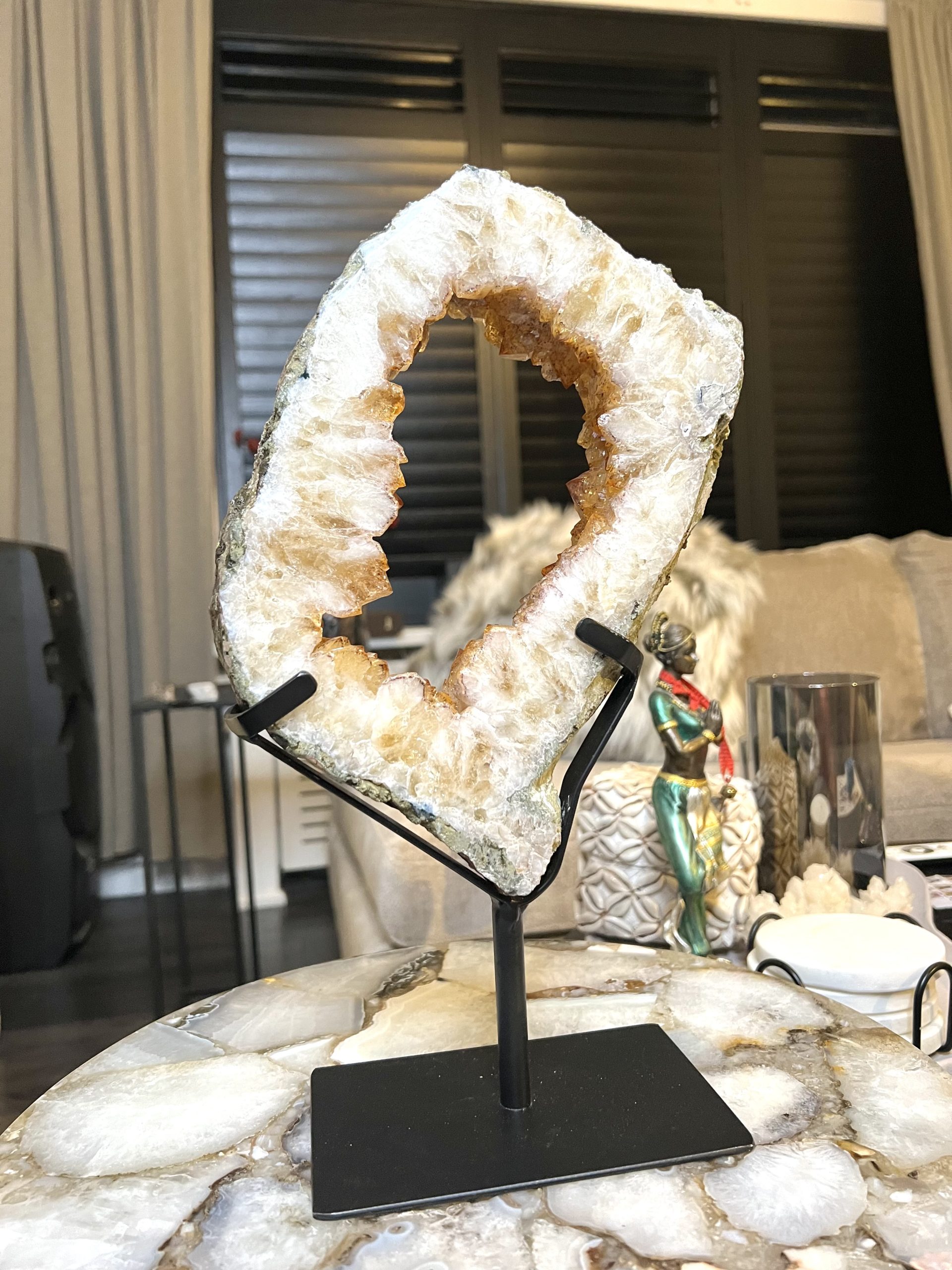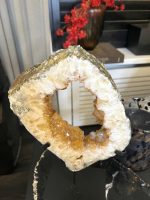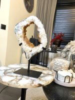 Door de omvang is het een onmiddellijke statement piece en het centrale aandachtspunt in elke kamer, van een woonkamer tot een ontvangsthal of kantoor. De holte is gevuld met duizenden sprankelende amethistkristallen. Deze druzy (kristal) formaties vangen het licht op een magische manier, wat zorgt voor een luxueuze en betoverende gloed.