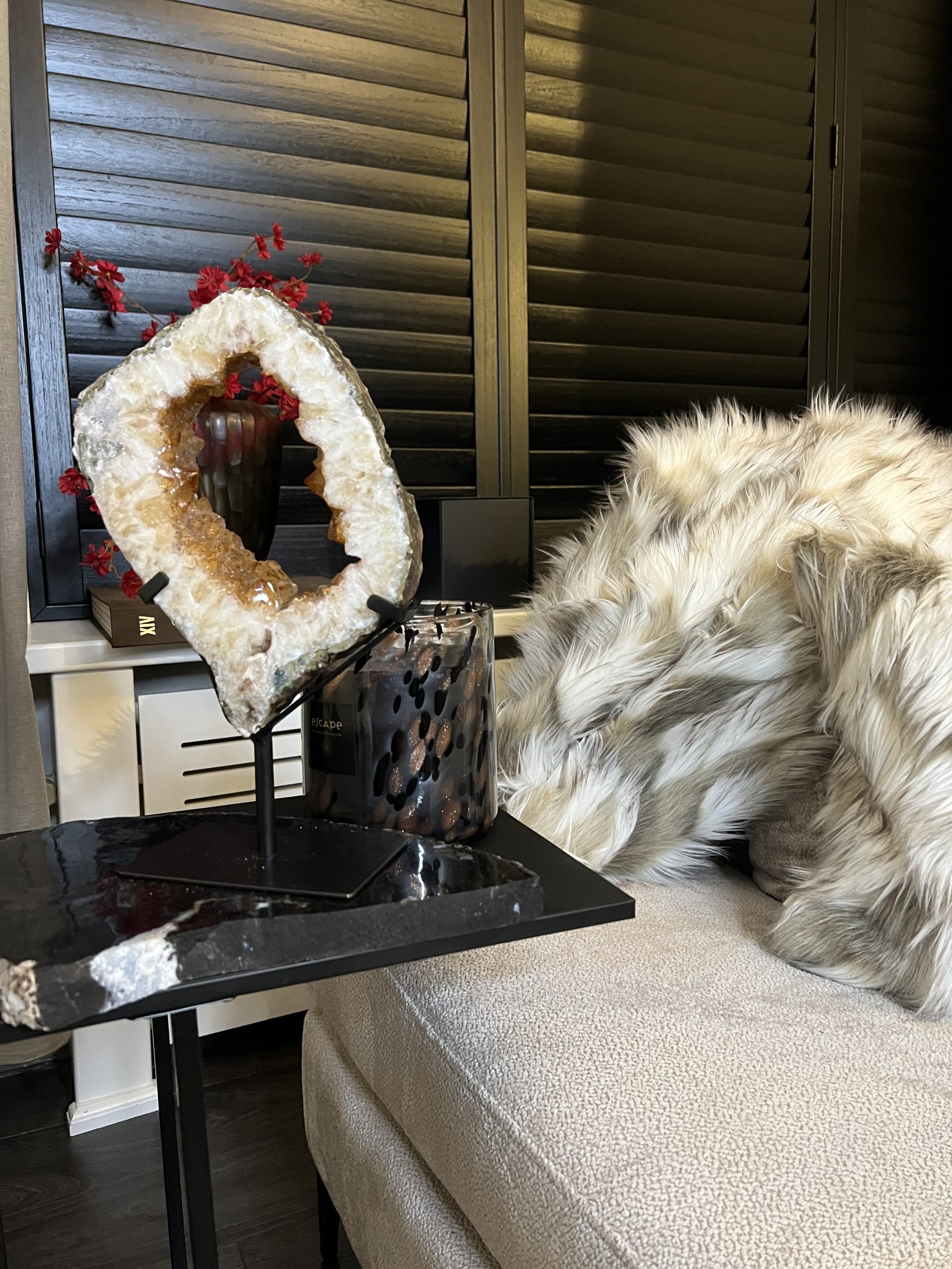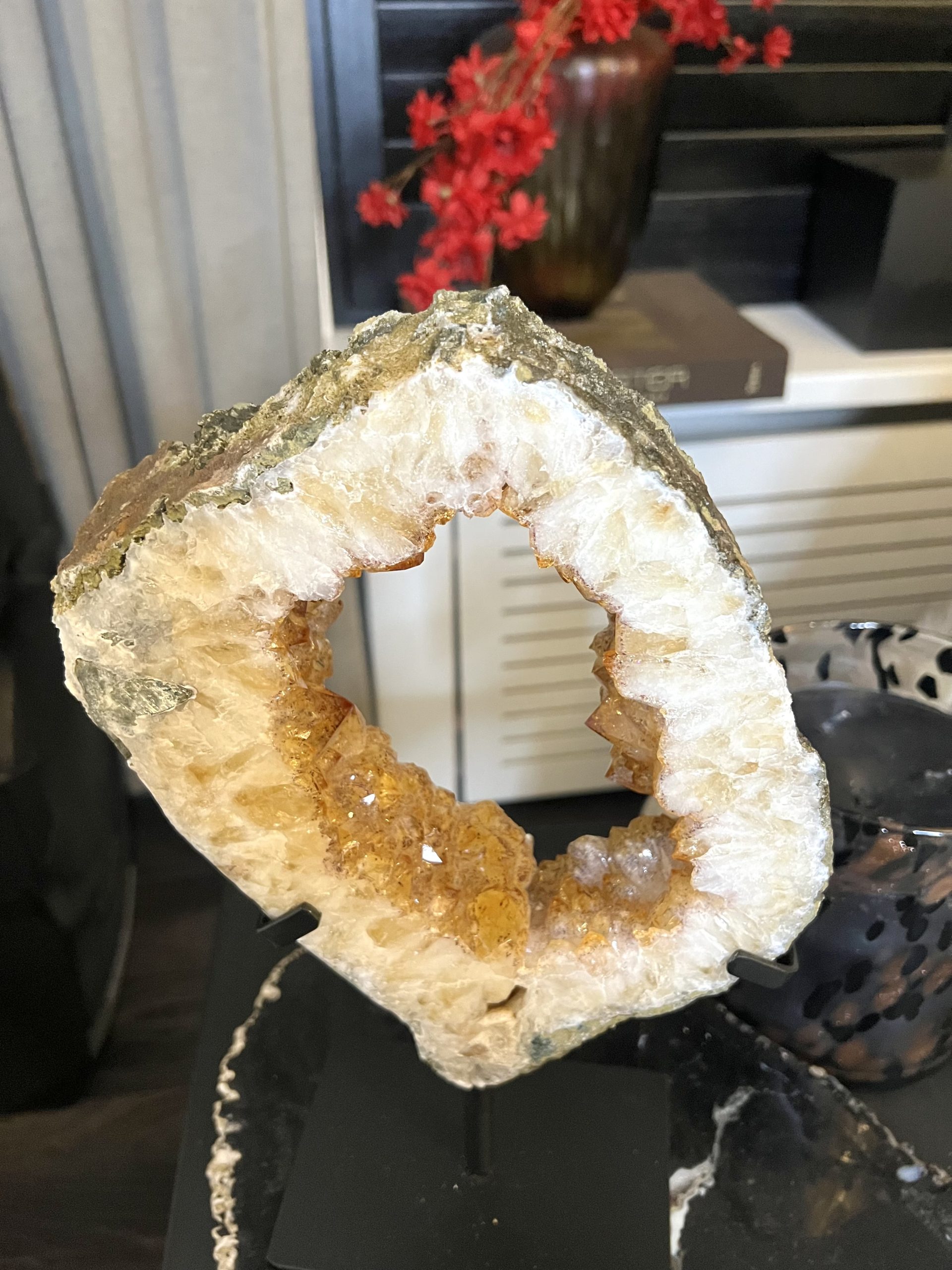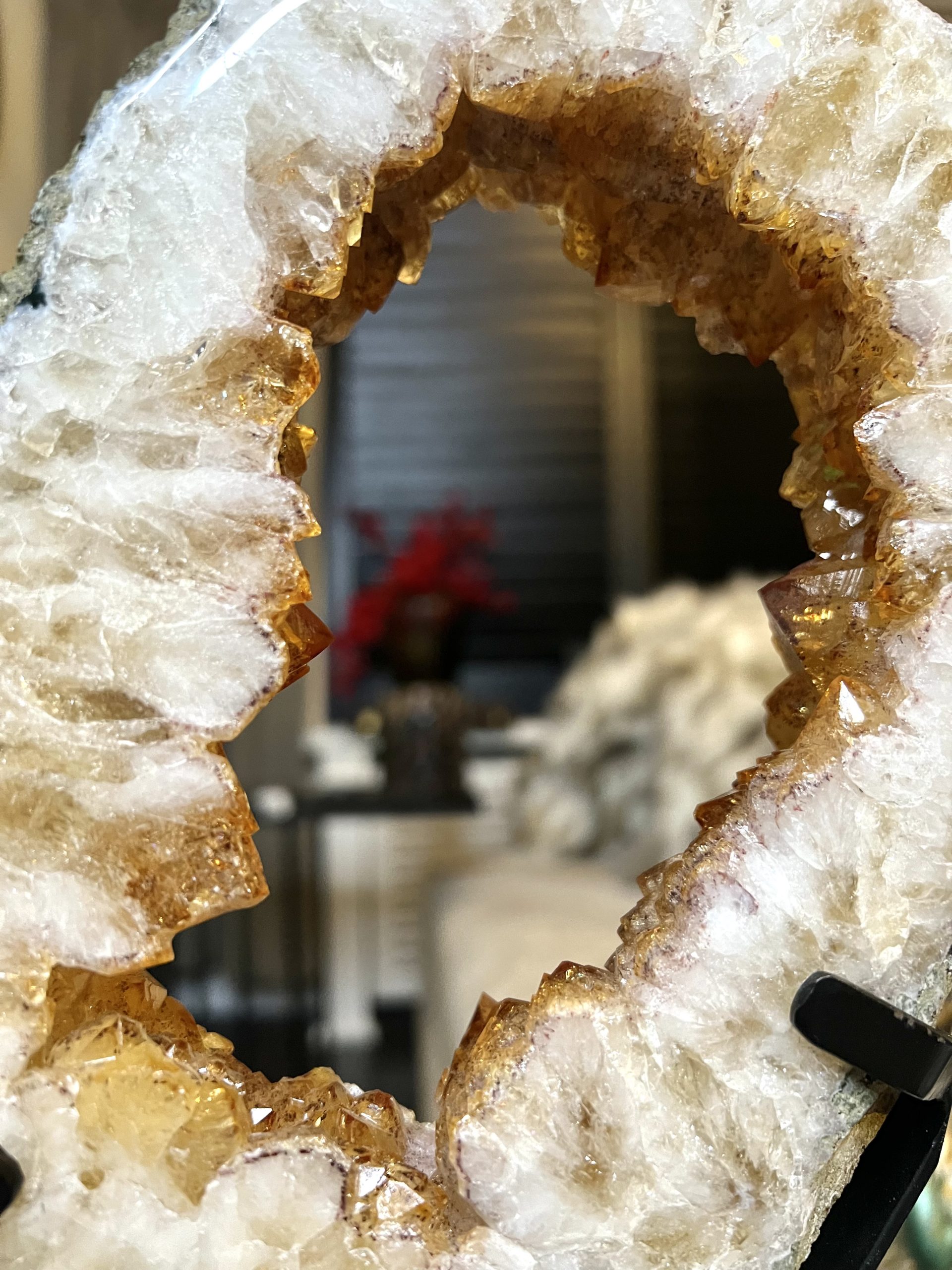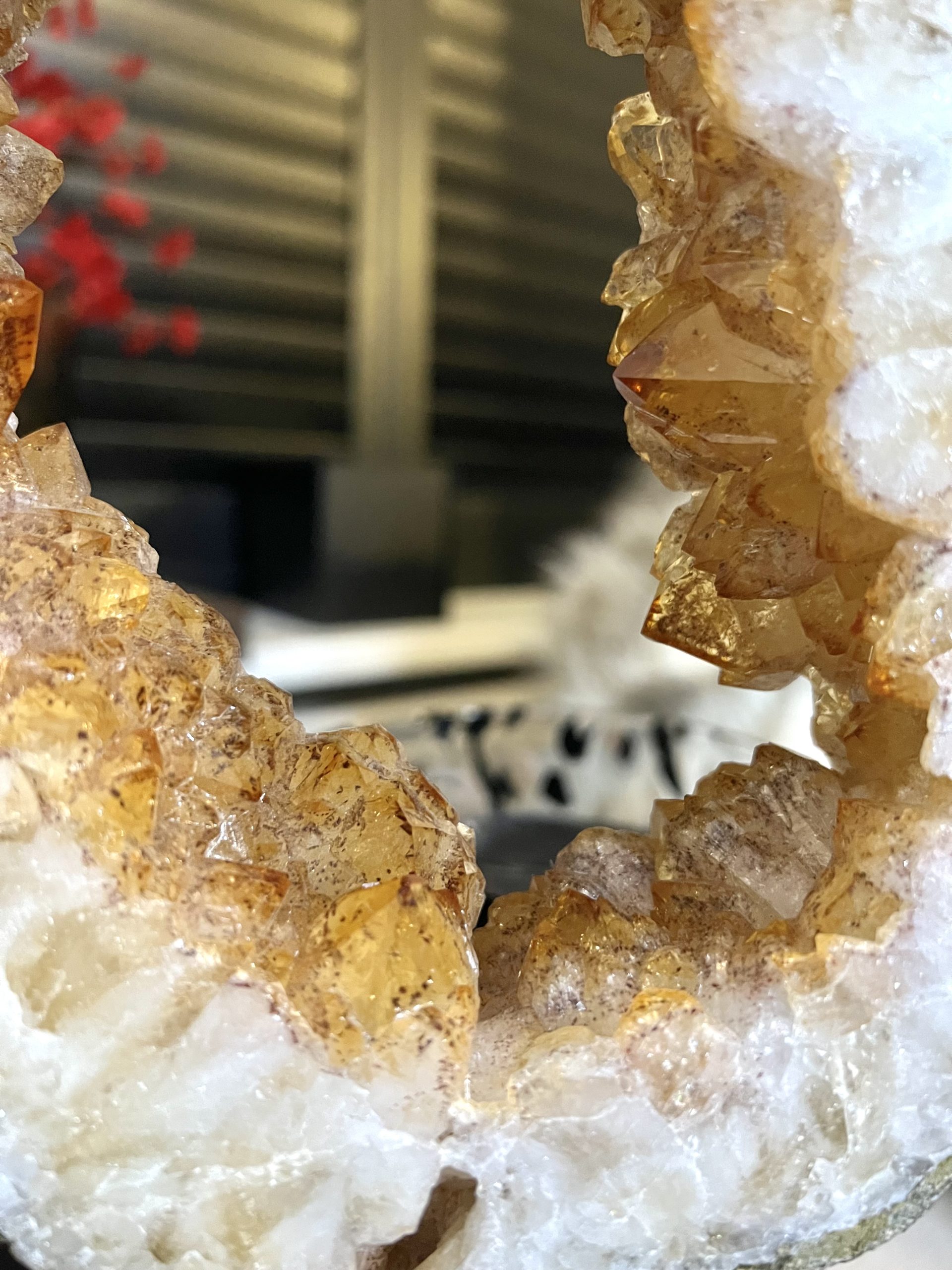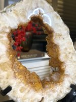 Door de omvang is het een onmiddellijke statement piece en het centrale aandachtspunt in elke kamer, van een woonkamer tot een ontvangsthal of kantoor. De holte is gevuld met duizenden sprankelende amethistkristallen. Deze druzy (kristal) formaties vangen het licht op een magische manier, wat zorgt voor een luxueuze en betoverende gloed.