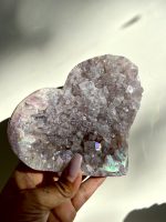 Een amethist die al deze kenmerken combineert – de sprankelende punten, roze kleur, regenbooginsluitsels én de hartvorm – is uniek. Het is niet zomaar een steen; het is een zeldzaam object dat zowel esthetische als symbolische waarde heeft.