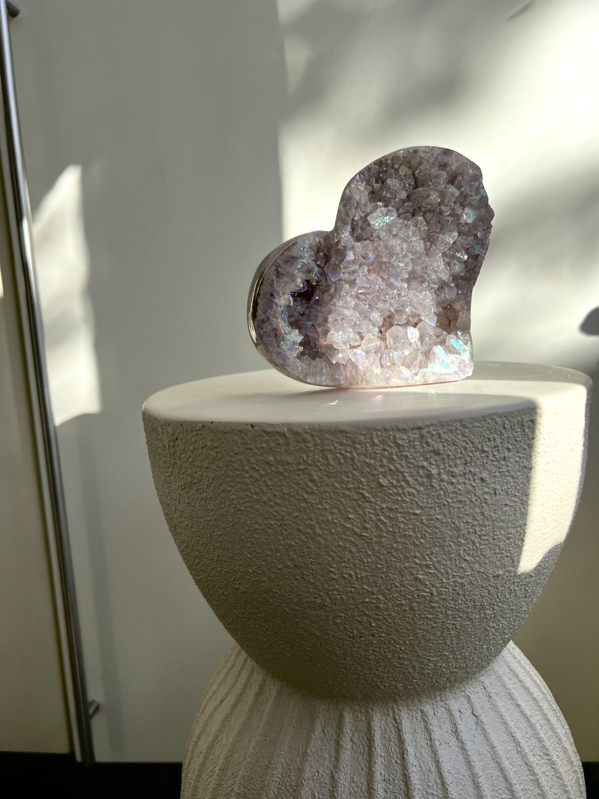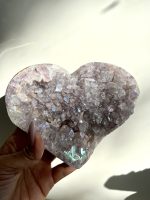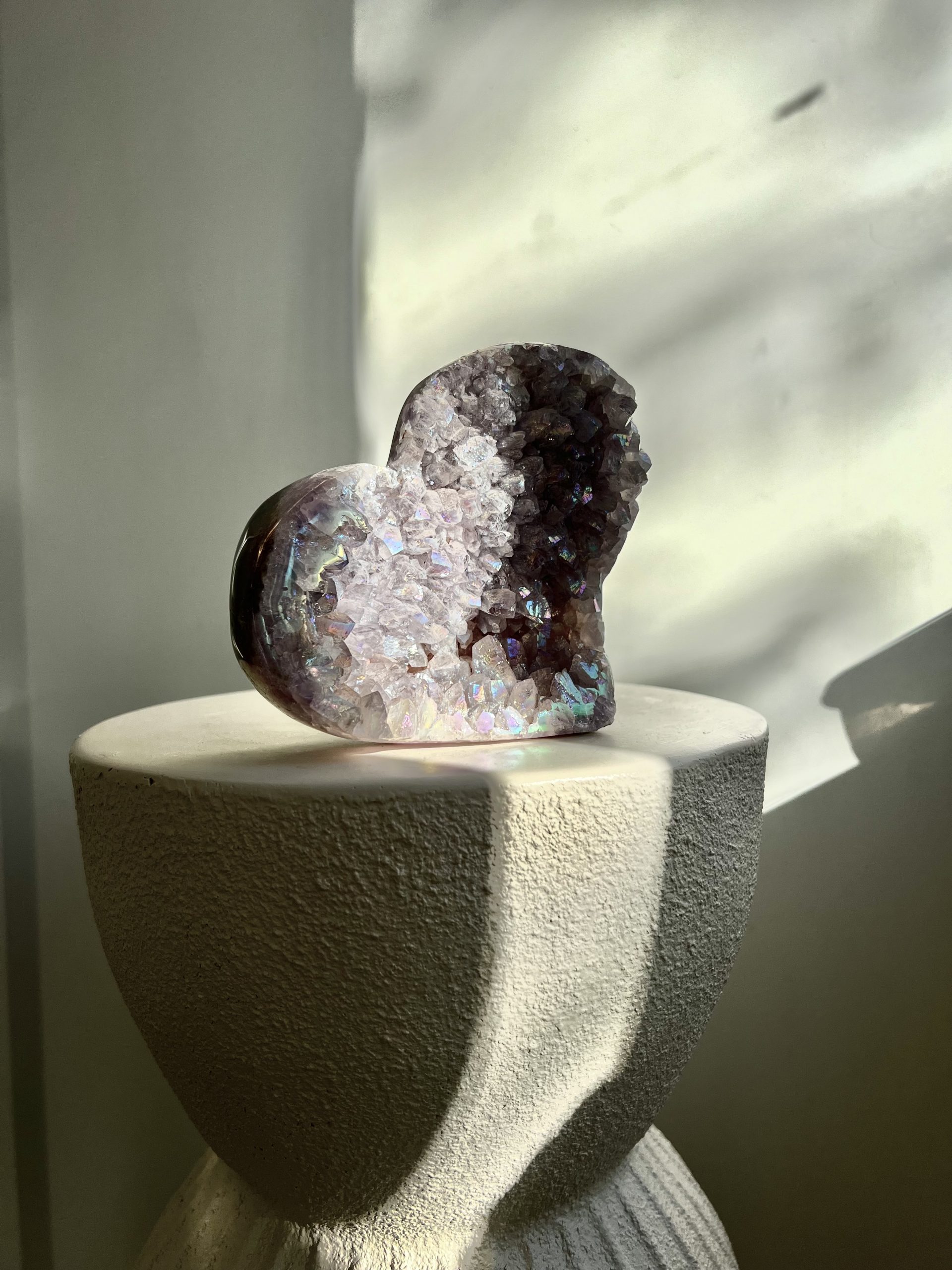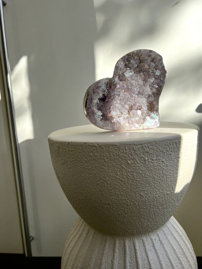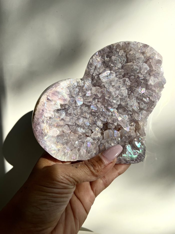 Een amethist die al deze kenmerken combineert – de sprankelende punten, roze kleur, regenbooginsluitsels én de hartvorm – is uniek. Het is niet zomaar een steen; het is een zeldzaam object dat zowel esthetische als symbolische waarde heeft.
