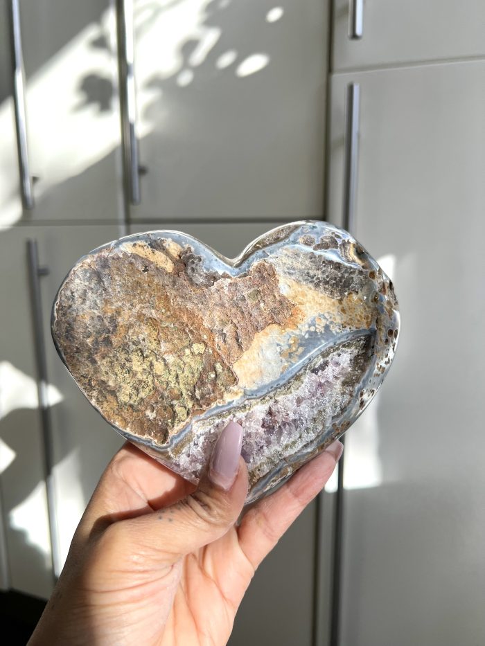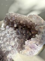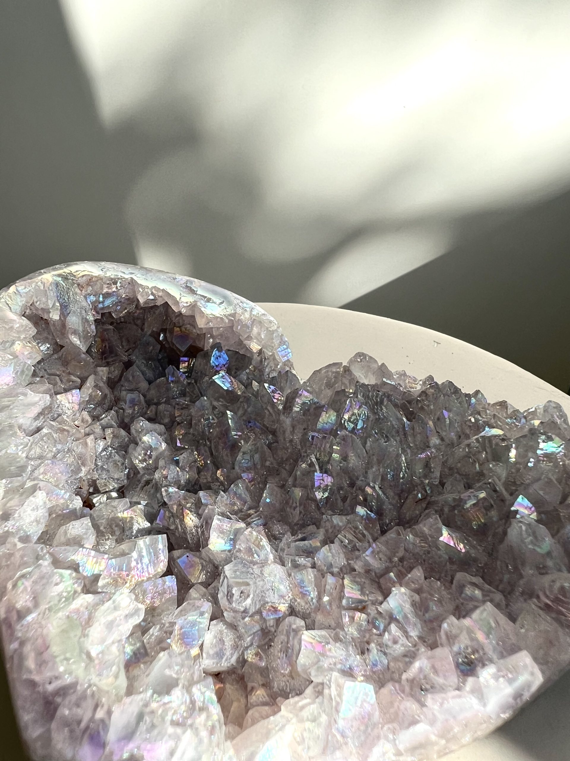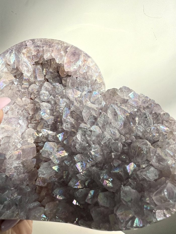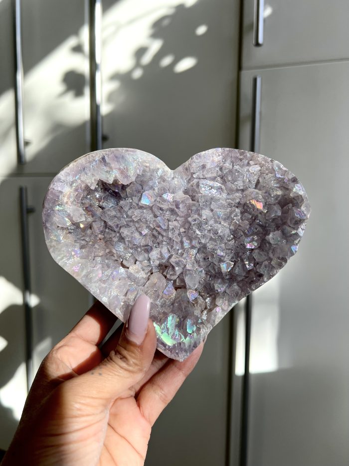 Een amethist die al deze kenmerken combineert – de sprankelende punten, roze kleur, regenbooginsluitsels én de hartvorm – is uniek. Het is niet zomaar een steen; het is een zeldzaam object dat zowel esthetische als symbolische waarde heeft.