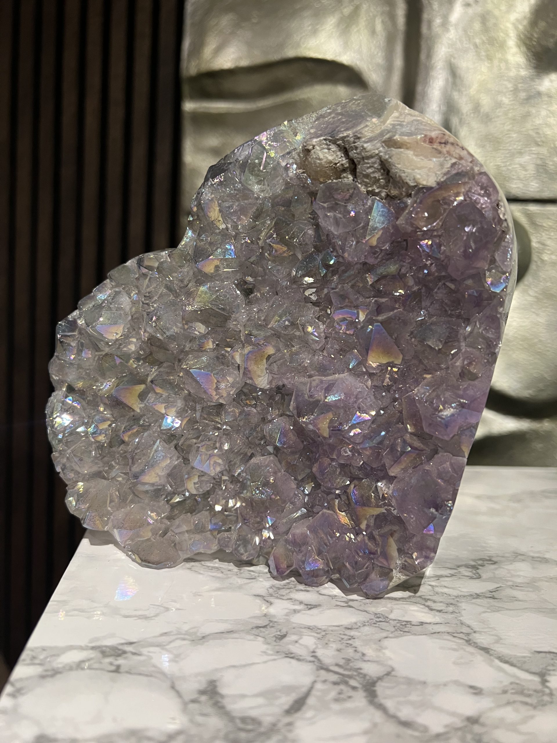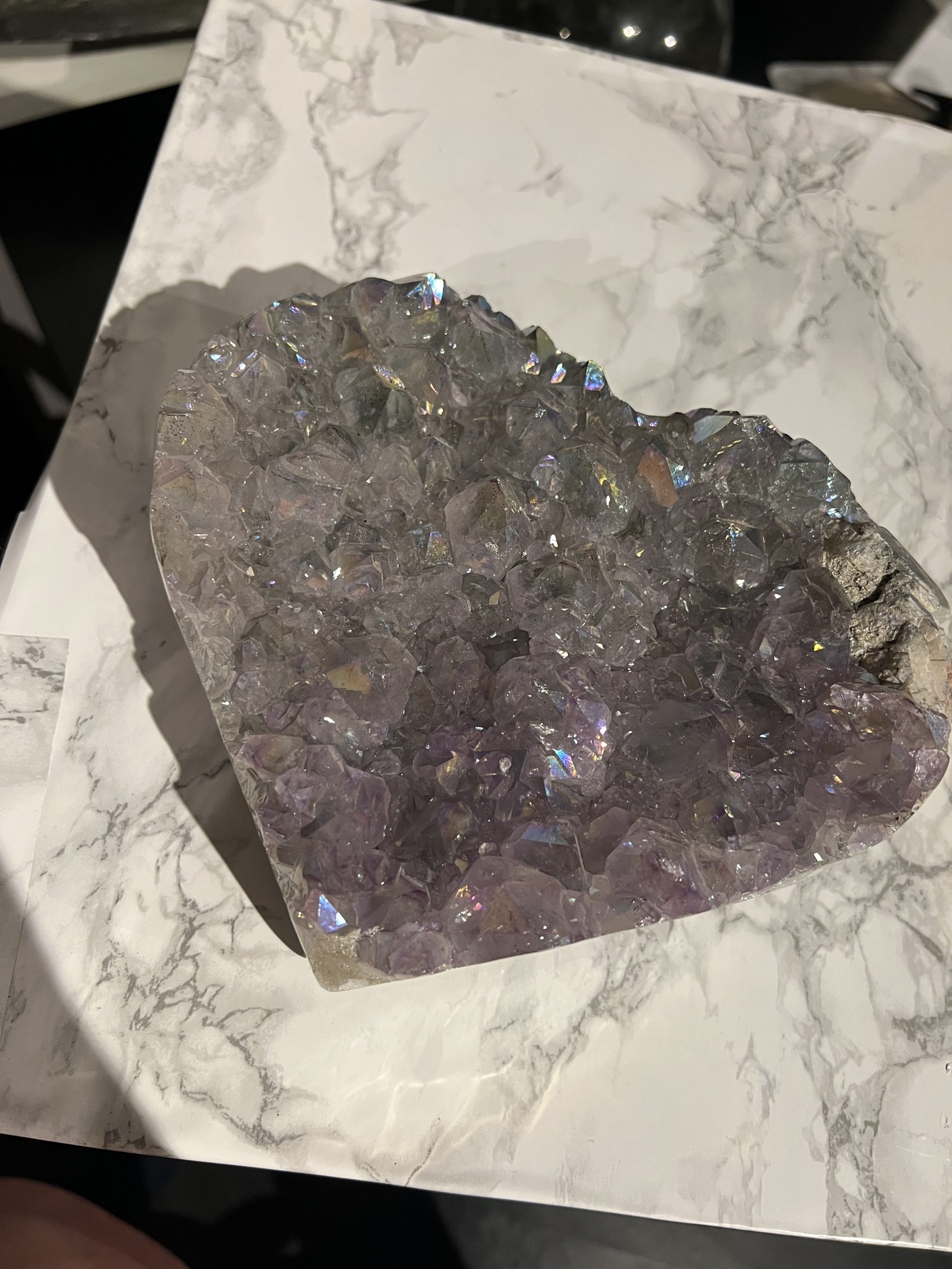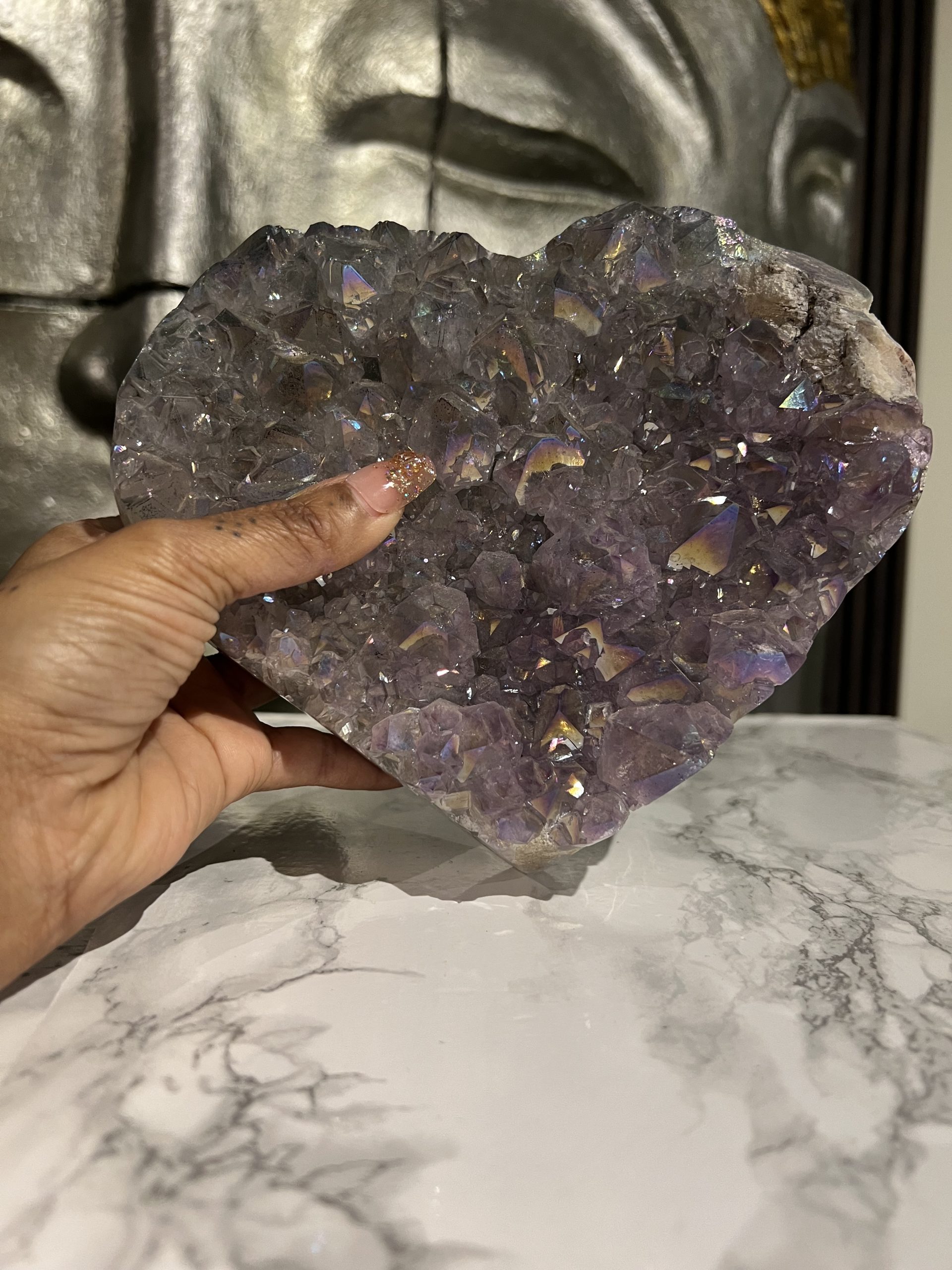 Een amethist die al deze kenmerken combineert – de sprankelende punten, roze kleur, regenbooginsluitsels én de hartvorm – is uniek. Het is niet zomaar een steen; het is een zeldzaam object dat zowel esthetische als symbolische waarde heeft.