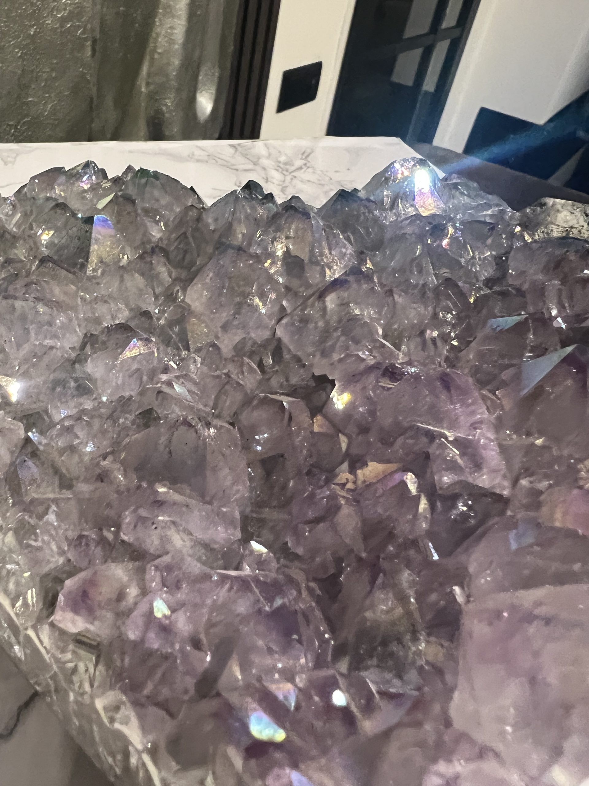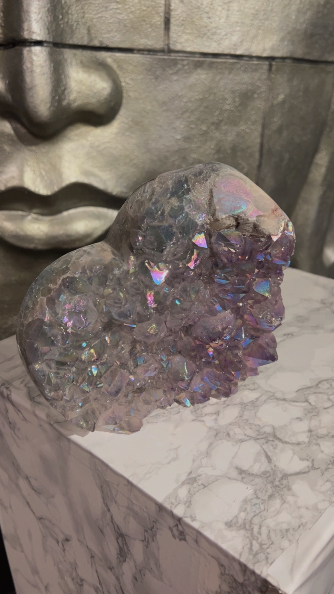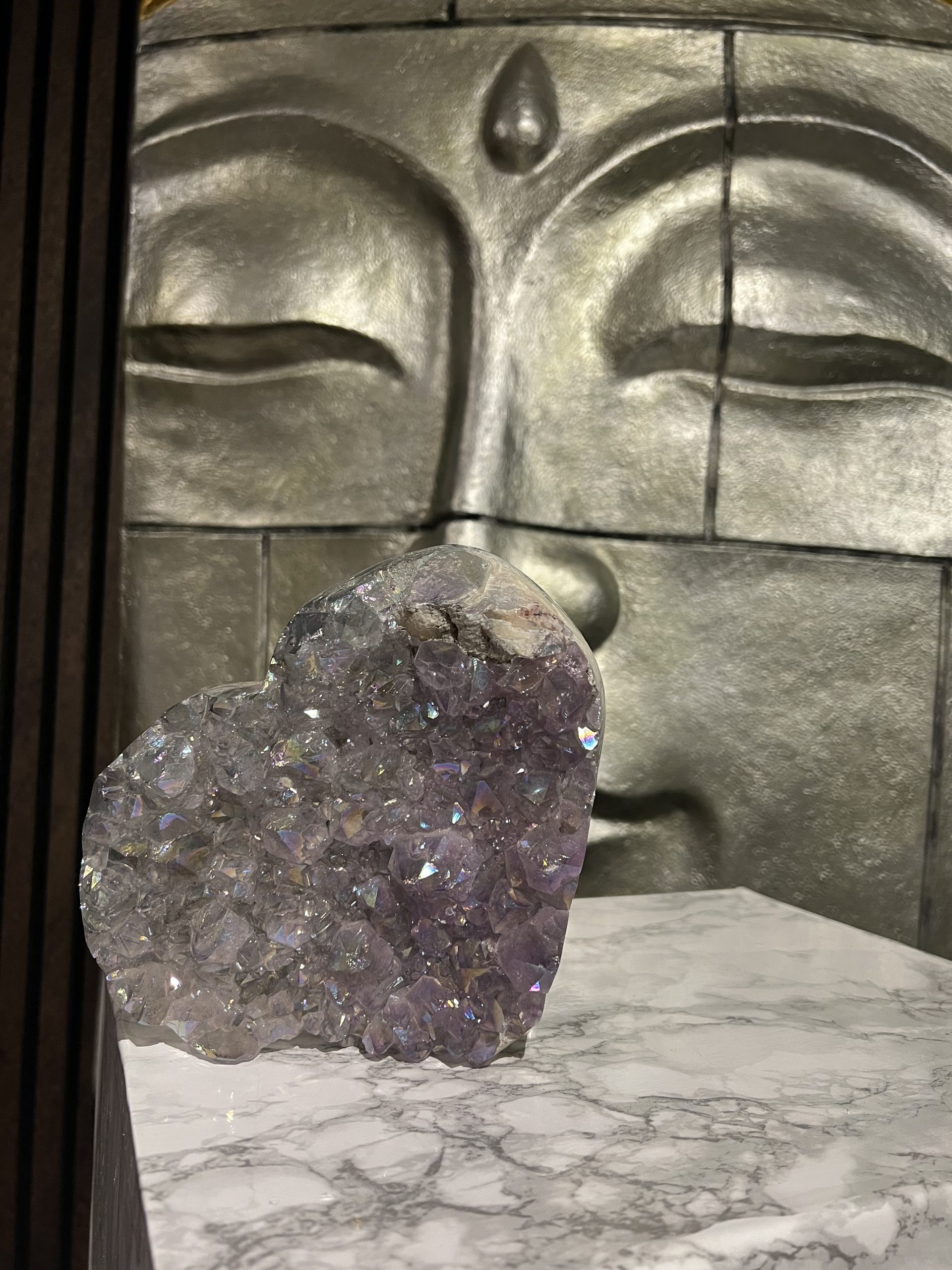 Een amethist die al deze kenmerken combineert – de sprankelende punten, roze kleur, regenbooginsluitsels én de hartvorm – is uniek. Het is niet zomaar een steen; het is een zeldzaam object dat zowel esthetische als symbolische waarde heeft.