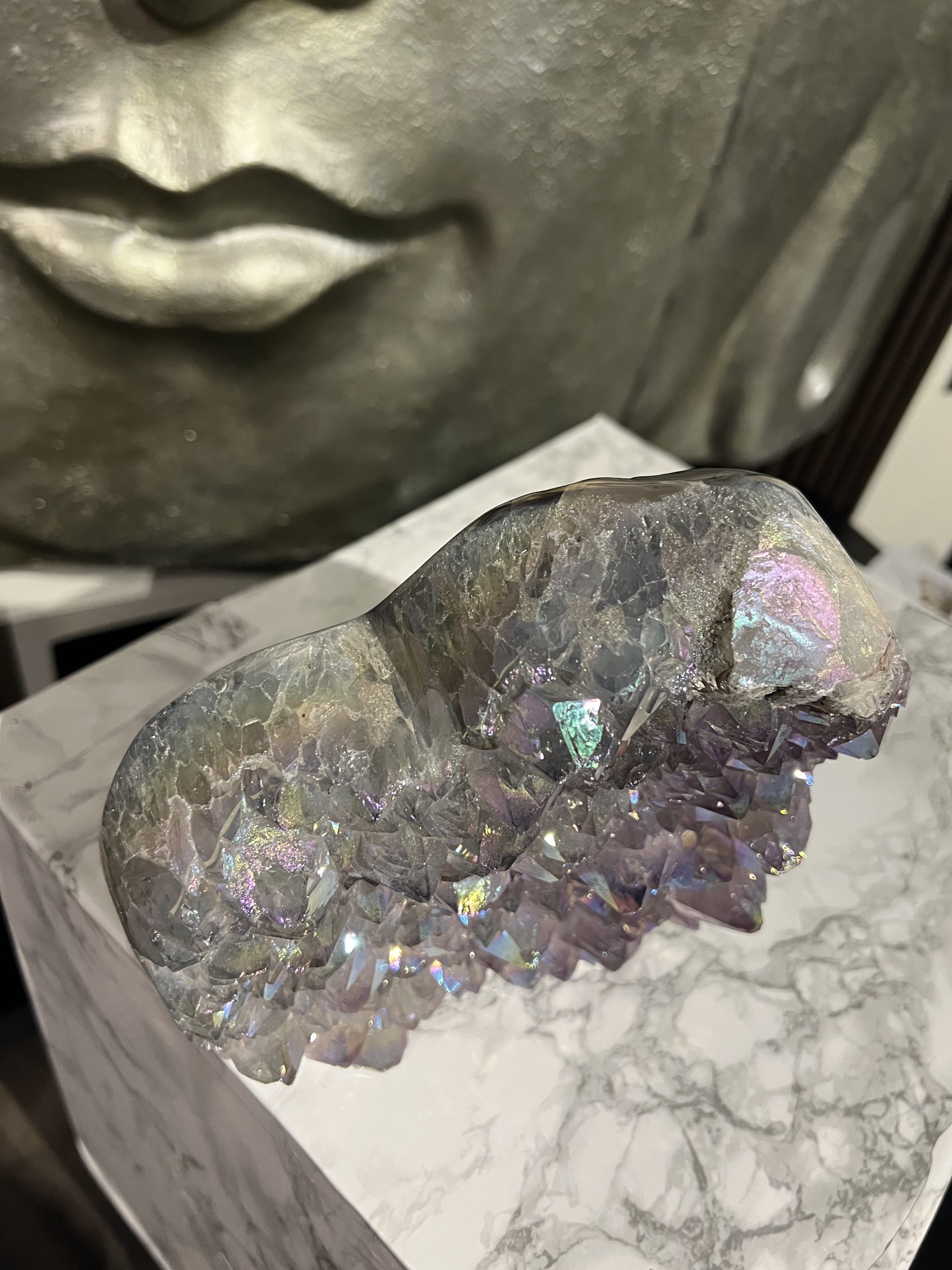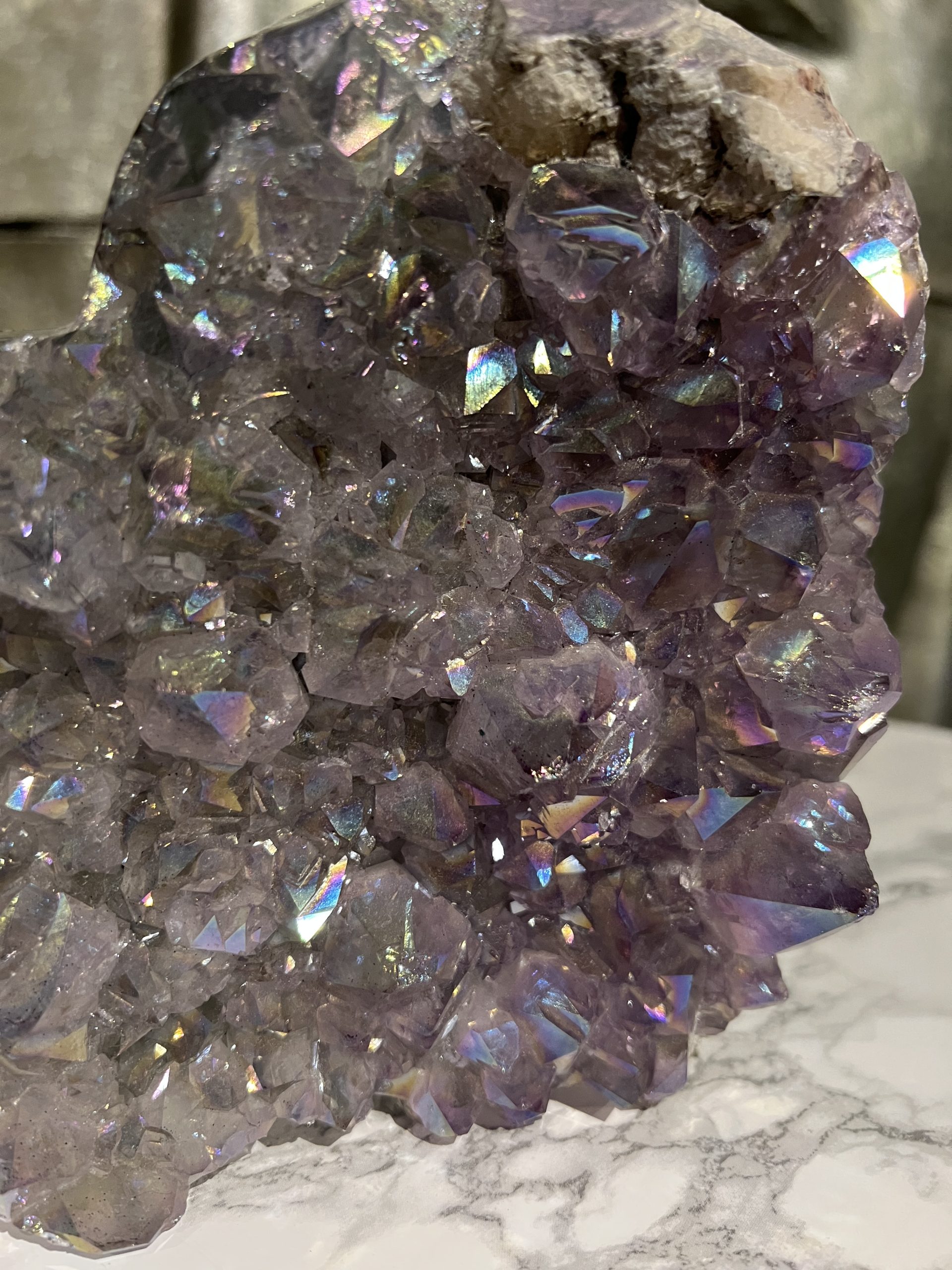 De Angel aura is een permanente coating wat het Crystal een kenmerkende iriserende glans en kleur geeft wat lijkt op die van een regenboog/parelmoer.