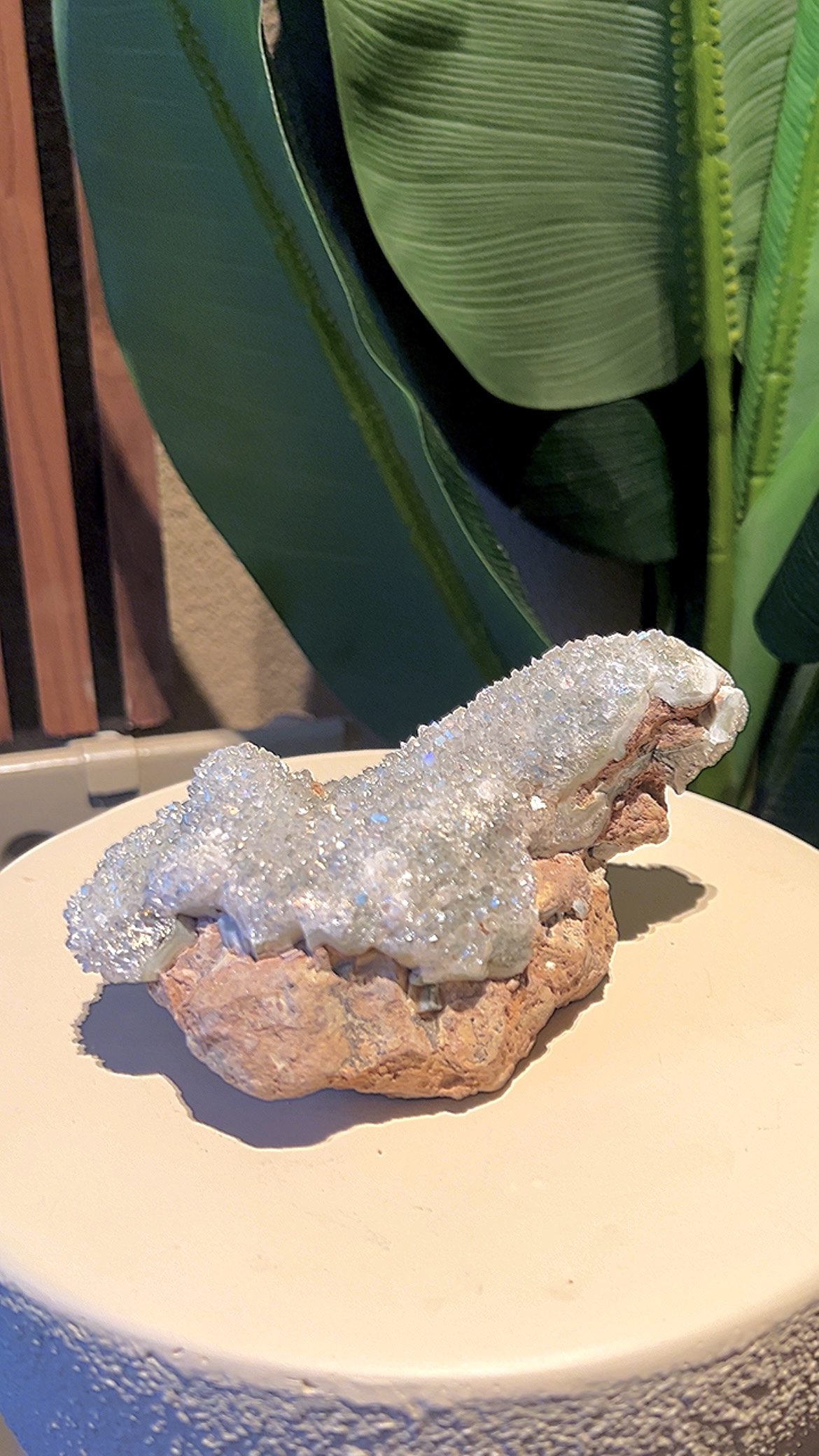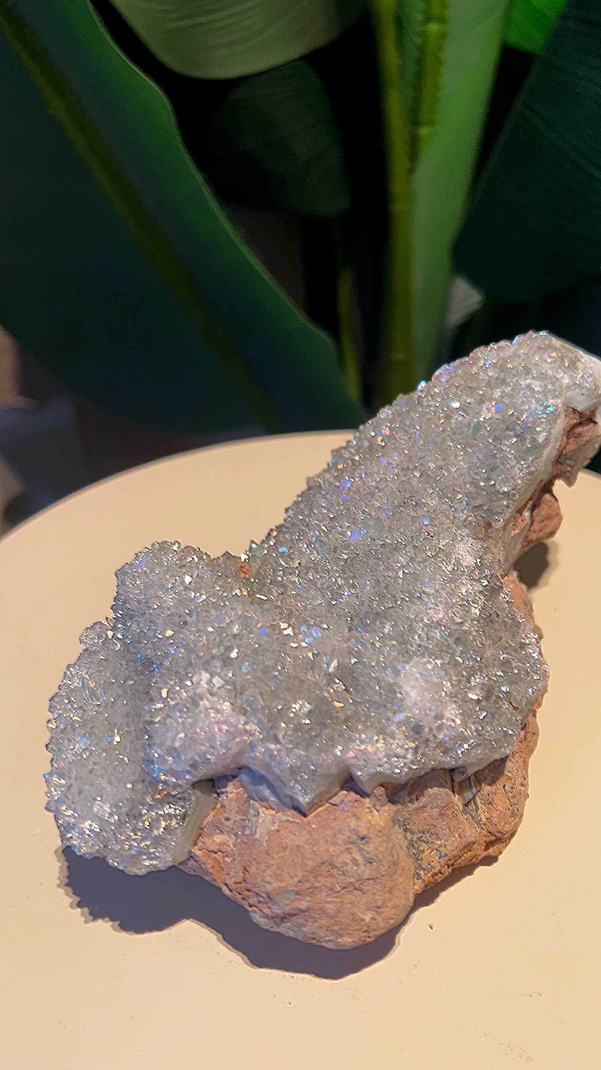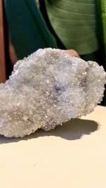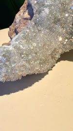 De werking van het kristal blijft hetzelfde, het vangt het licht op een unieke manier en verspreidt een zachte, etherische glans door de ruimte, wat een gevoel van helderheid en verfijning toevoegt. Het kan dienen als een prachtig statement piece of een subtiele blikvanger.