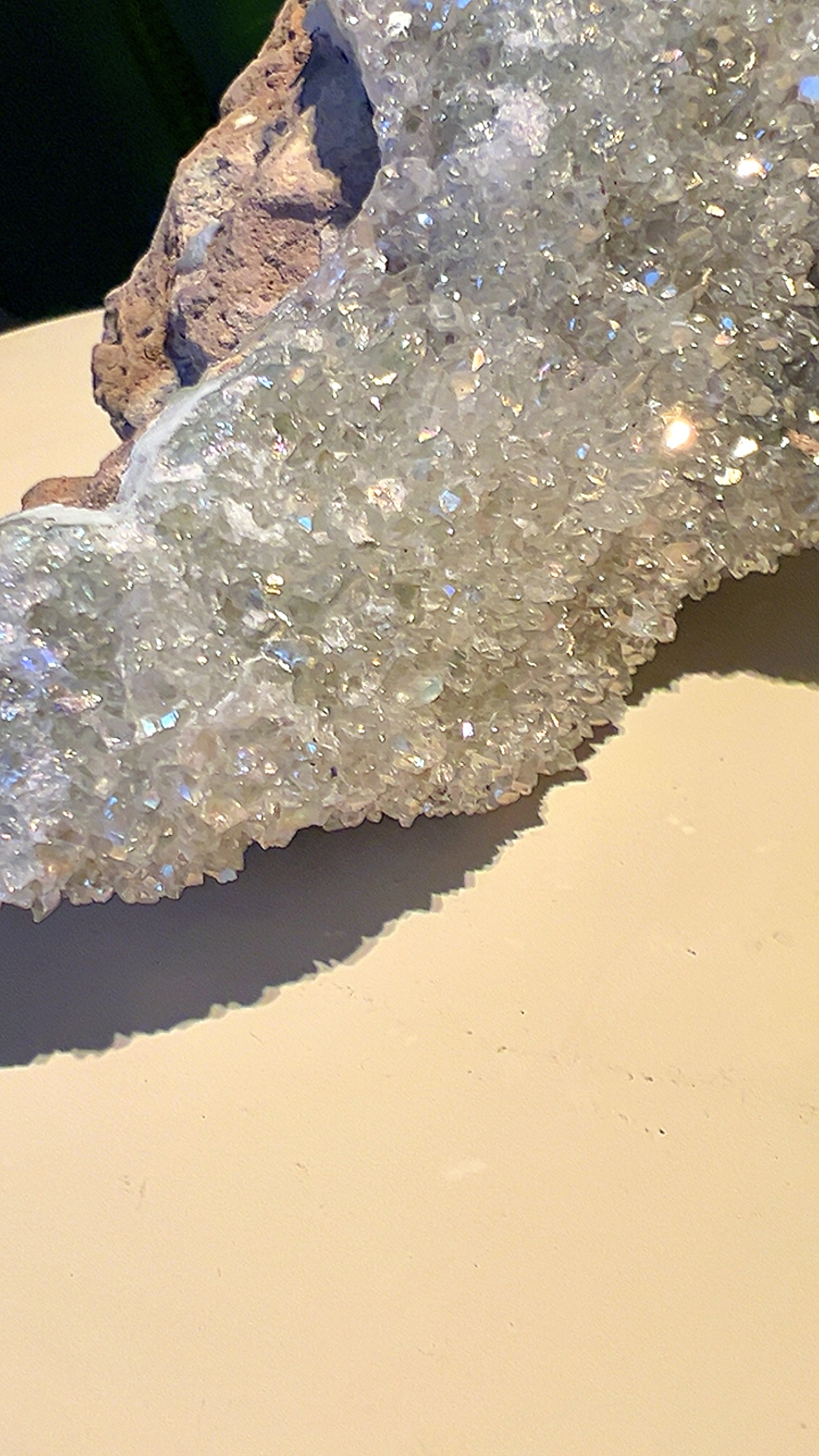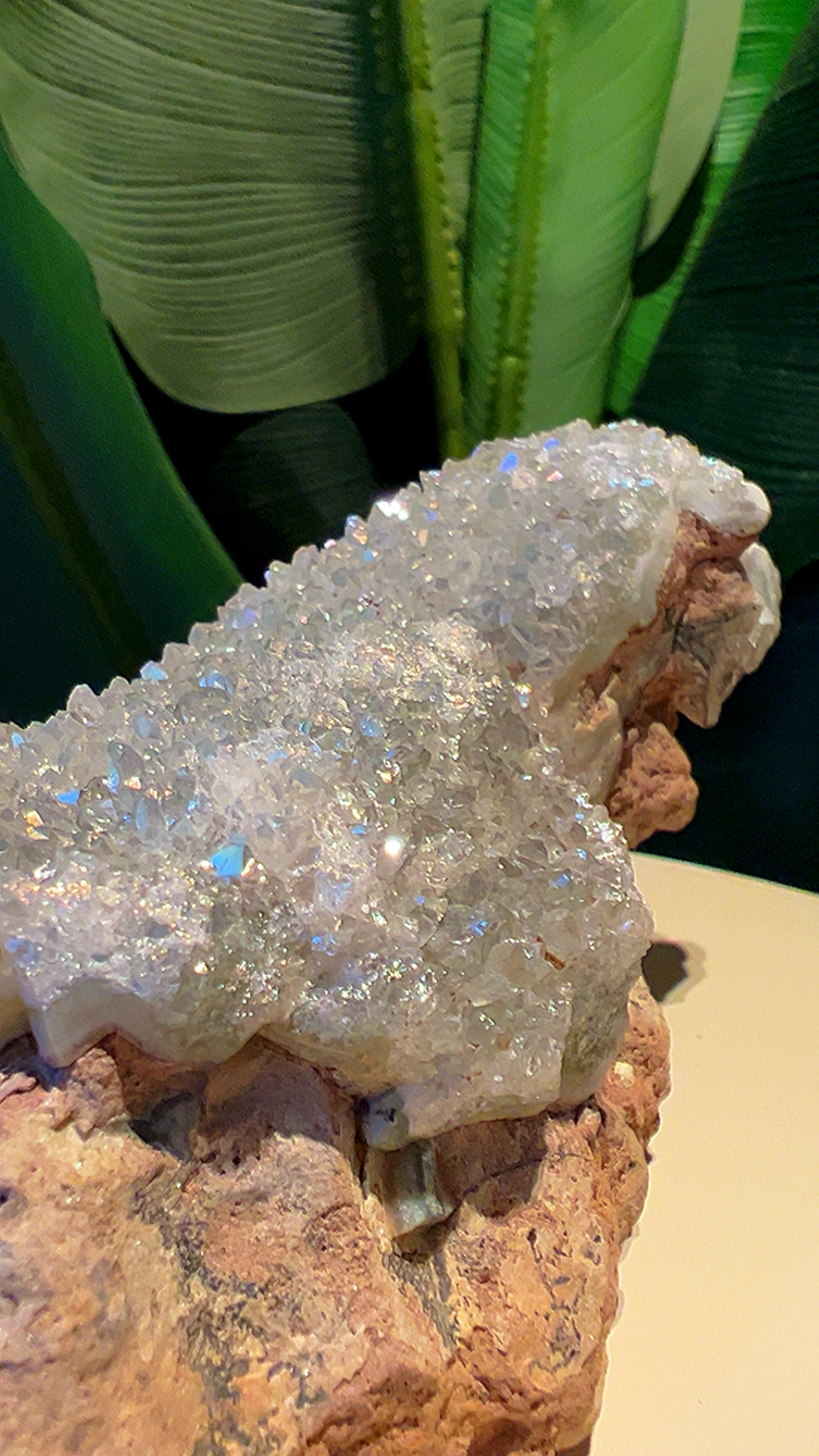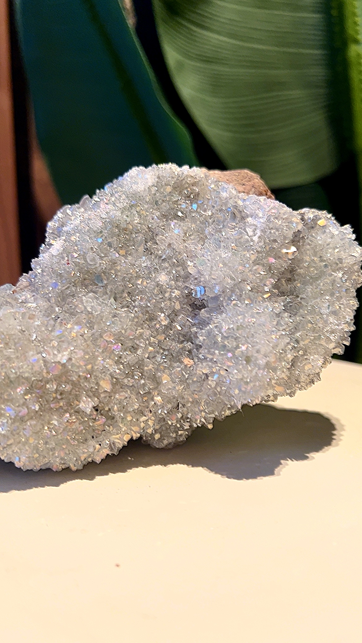 Angel Aura Kwarts is feitelijk kwarts dat is behandeld met platina, zilver en/of andere metalen onder hoge hitte in een vacuüm. Dit creëert een iriserende, regenboogachtige glans die varieert van doorschijnend blauw, roze en geel.