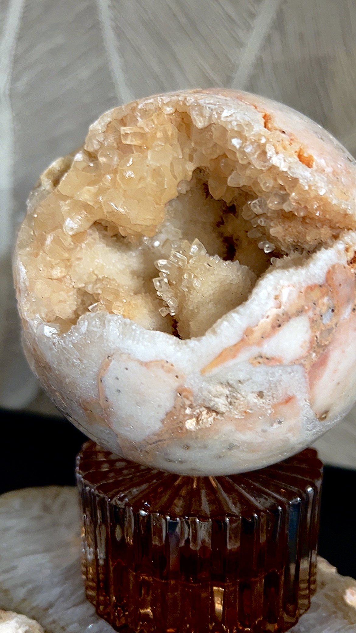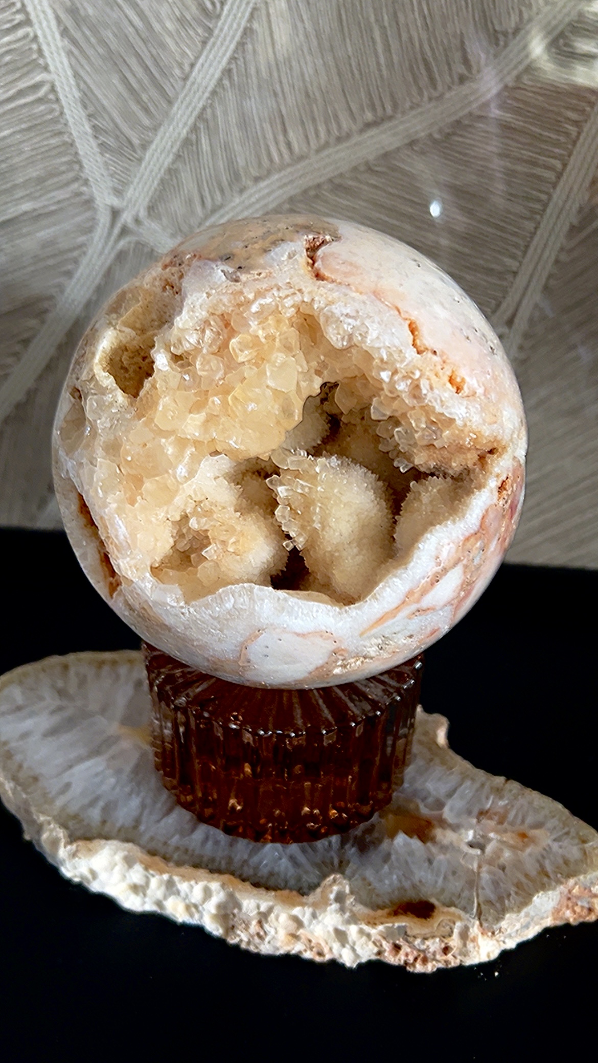 Styling tip: Plaats de bol op een verlichte standaard. Omdat Chalcedoon vaak licht doorschijnend is, krijgt de bol een magische gloed wanneer er van onderen of van achteren licht op valt.