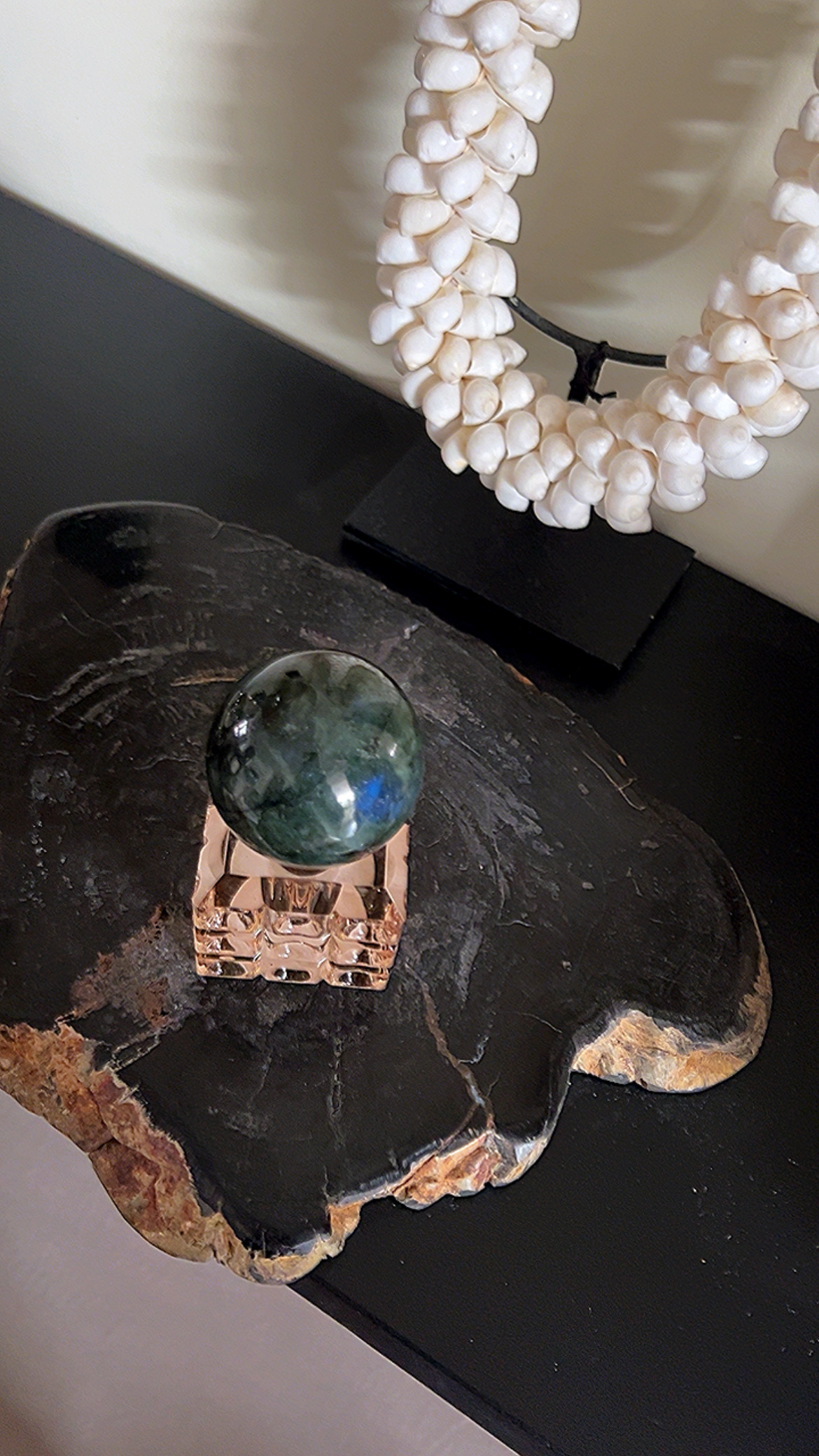 Labradoriet is de steen van transformatie. Als je in een fase van je leven zit waarin veel verandert (verhuizing, nieuwe baan, persoonlijke groei), biedt de steen kracht en volharding. De bol herinnert je eraan dat er, zelfs in donkere tijden, altijd licht en kleur onder de oppervlakte schuilgaat.