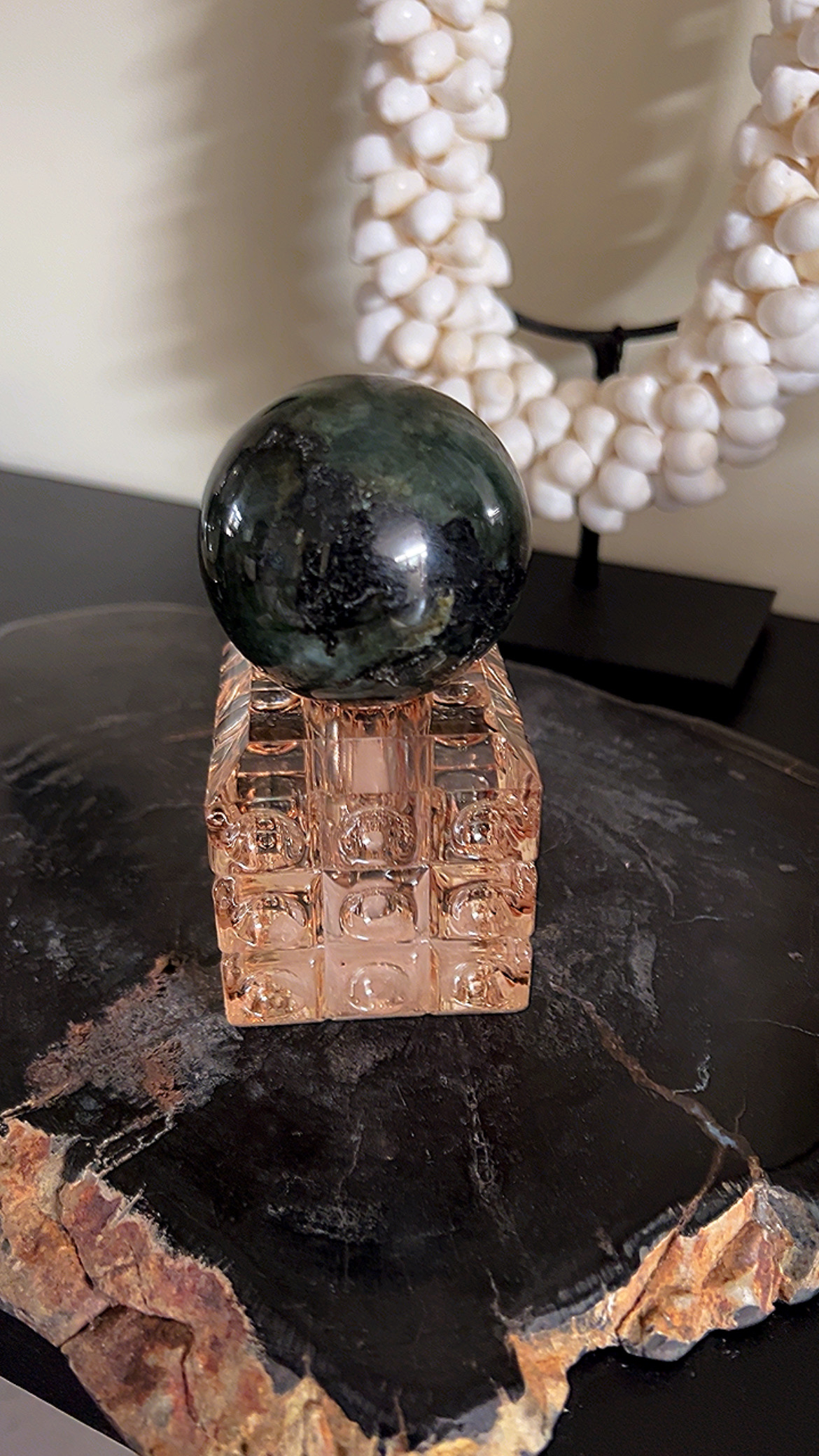 Op het eerste gezicht lijkt een labradoriet bol misschien een bescheiden, donkere steen. Maar zodra het licht er vanuit de juiste hoek op valt, gebeurt er iets magisch: