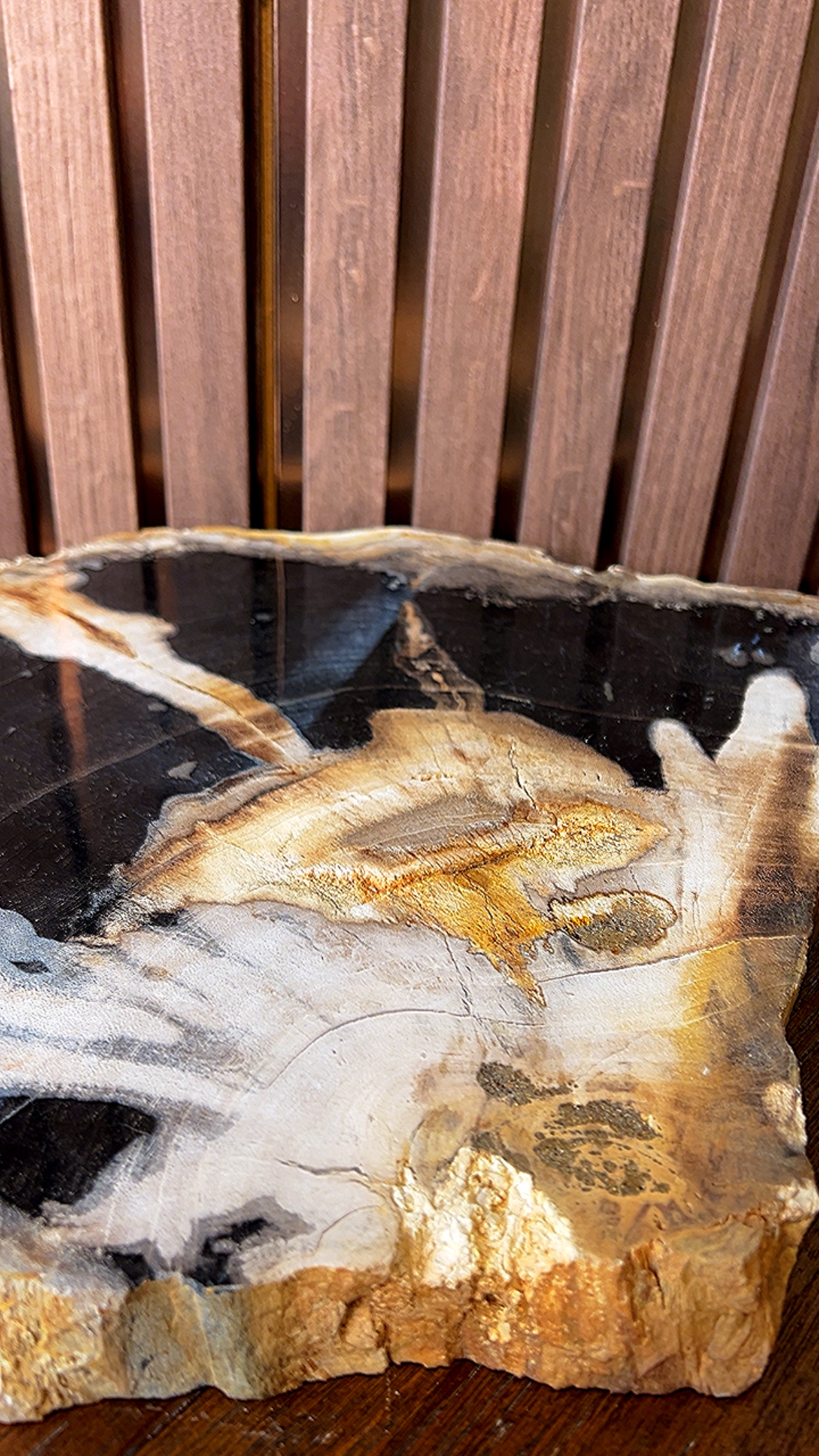 Haal een kracht in huis met dit decoratieve stuk versteend hout. De prachtige aardetinten en zichtbare jaarringen maken het een tijdloze uitblinker. Dit versteende hout stuk is afkomstig vanuit Indonesie.